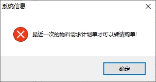 轉(zhuǎn)請購單只能轉(zhuǎn)入最后一次MRP計(jì)算的欠料數(shù),如果查找的不是最后一次MRP計(jì)劃單則不能生成請購單,如下圖