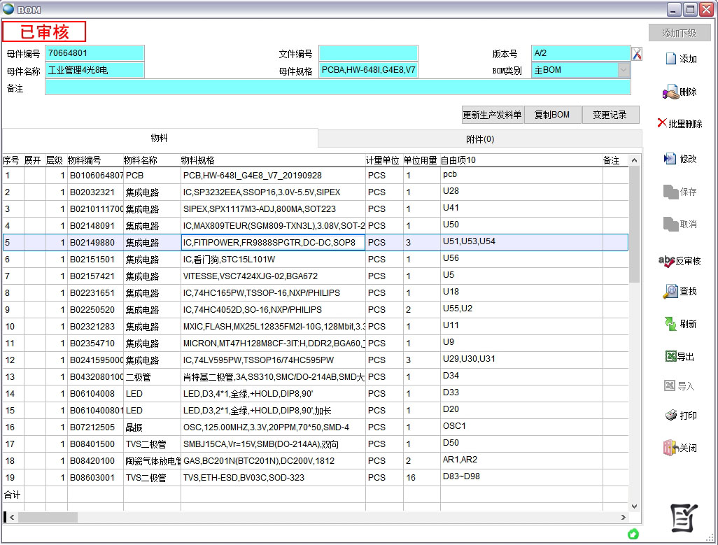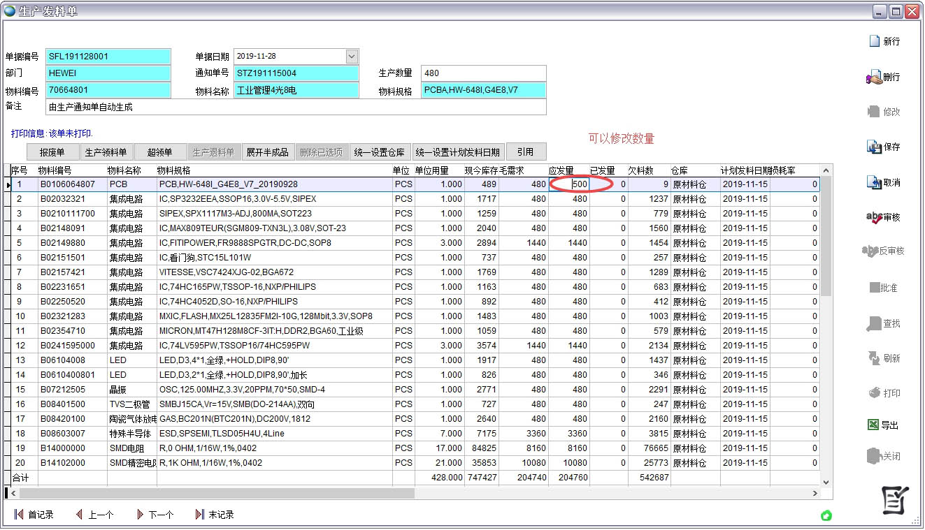發(fā)料單的作用有三個(gè):第一,將生產(chǎn)通知單的產(chǎn)品按BOM用量展開成原材料,可以對BOM用量進(jìn)行修改;