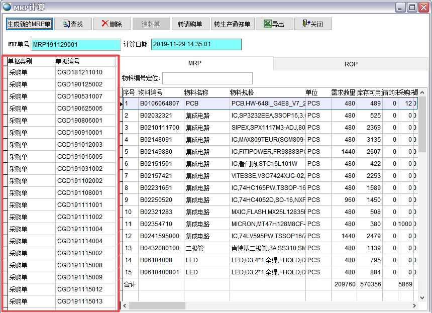 左邊表格是所有參與計(jì)算的單據(jù),右邊表格是物料的需求