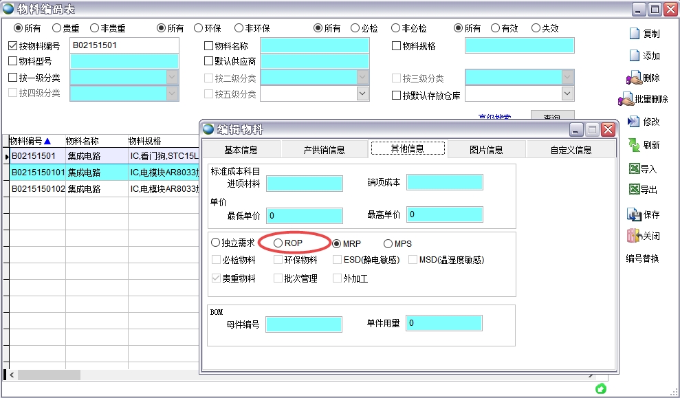 MRP模式是根據(jù)BOM用量進(jìn)行計(jì)算,ROP模式較為簡單,不需要BOM,只要設(shè)置安全庫存就可以。比如包裝材料,如托盤、包裝袋等可以不添加到BOM中,只要低于安全庫存就會自動生成請購單,這樣可以簡化MRP計(jì)算量。