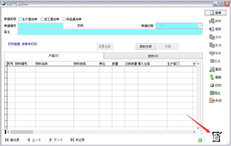 生產(chǎn)通知單列表打開路徑:【主菜單】->【計(jì)劃】->【生產(chǎn)通知單】->點(diǎn)右下角