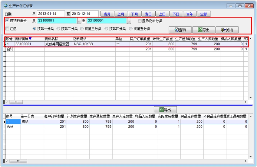 可通過(guò)幾種篩選條件進(jìn)行查詢所需的生產(chǎn)計(jì)劃,比如,需要查詢光伏逆變器的生產(chǎn)計(jì)劃,可通過(guò)按物料編號(hào)進(jìn)行查詢,如下圖。