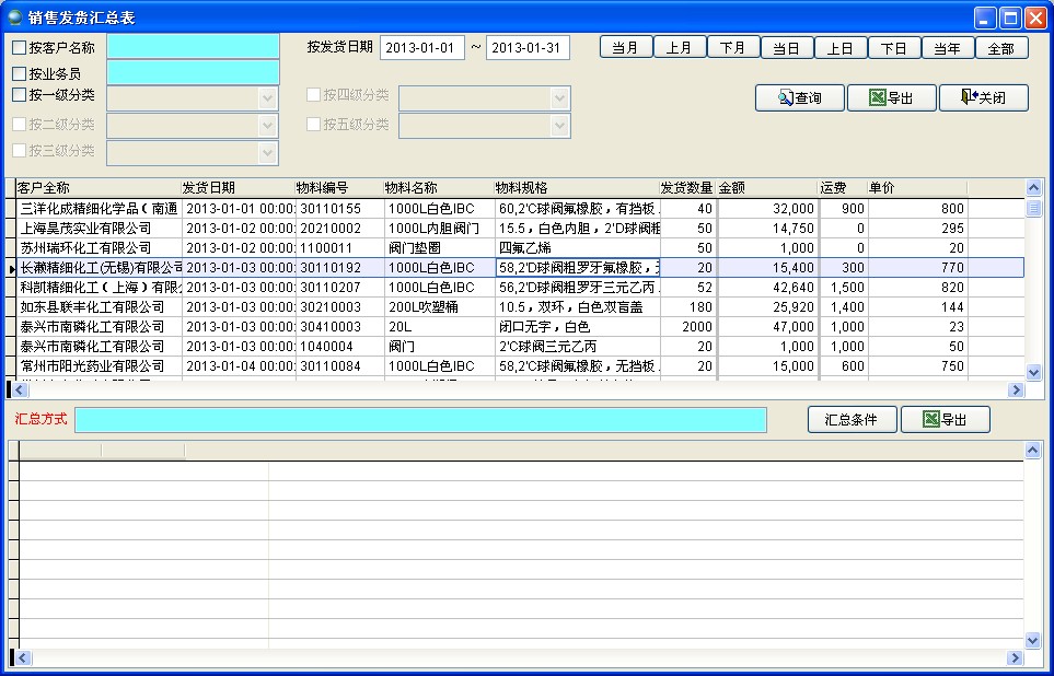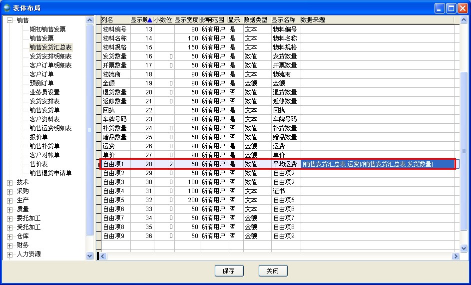 部分單據(jù)會(huì)預(yù)留自由項(xiàng)字段供用戶日后使用。如下圖的銷售發(fā)貨匯總表,出于管理需要我們需要增加一個(gè)字段平均運(yùn)費(fèi),來計(jì)算平均每件貨物所承擔(dān)的運(yùn)費(fèi)。
