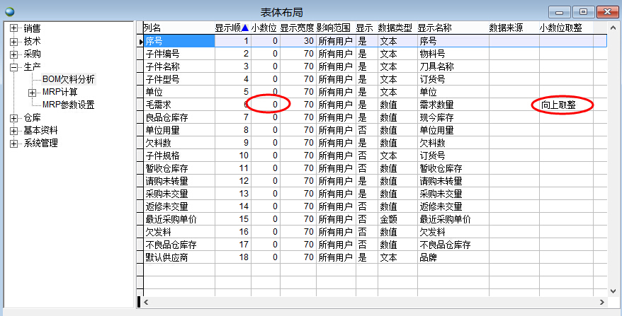 如下圖所示,在進(jìn)行BOM欠料分析時(shí),需求數(shù)量會(huì)存在小數(shù)位,但我們需要向上取整,如實(shí)際需求數(shù)量為1.1時(shí),應(yīng)該取整變成2