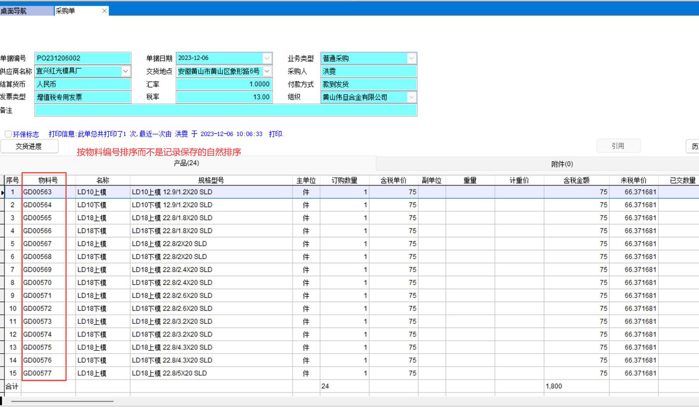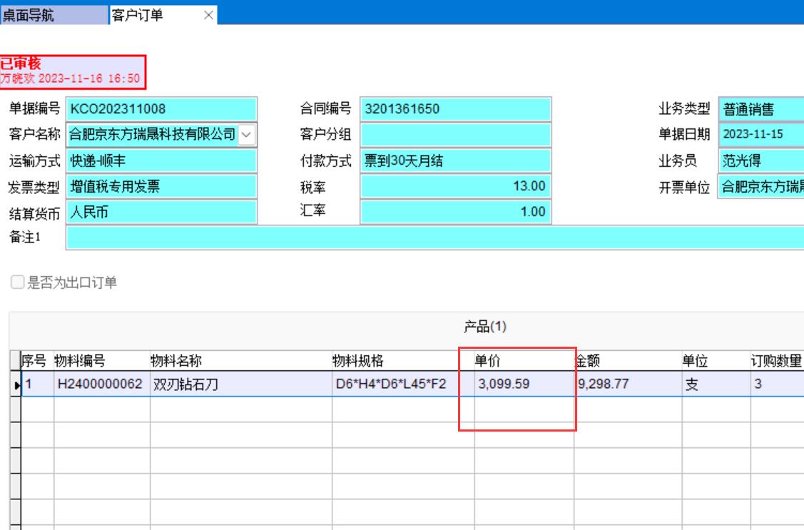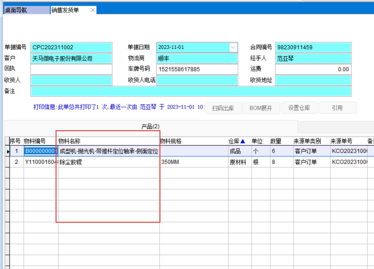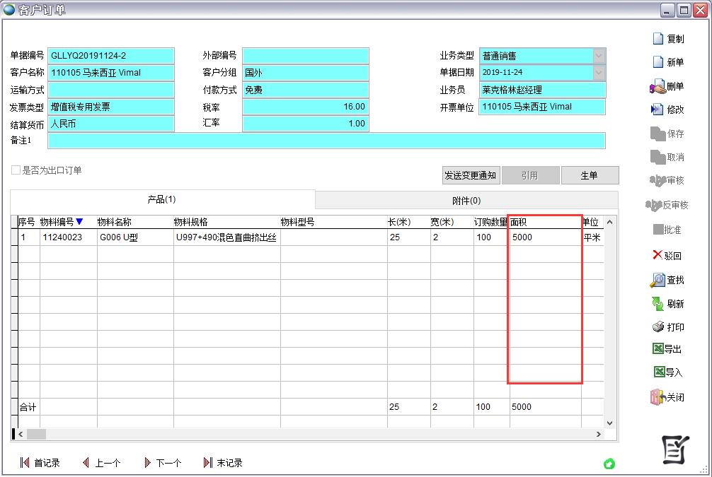 以下圖為例,在客戶訂單中長、寬的數(shù)據(jù)來自物料編碼表,訂購數(shù)量是客戶訂單中手填的,面積套用了計(jì)算公式是自動(dòng)計(jì)算得出的,面積=長*寬*訂購數(shù)量