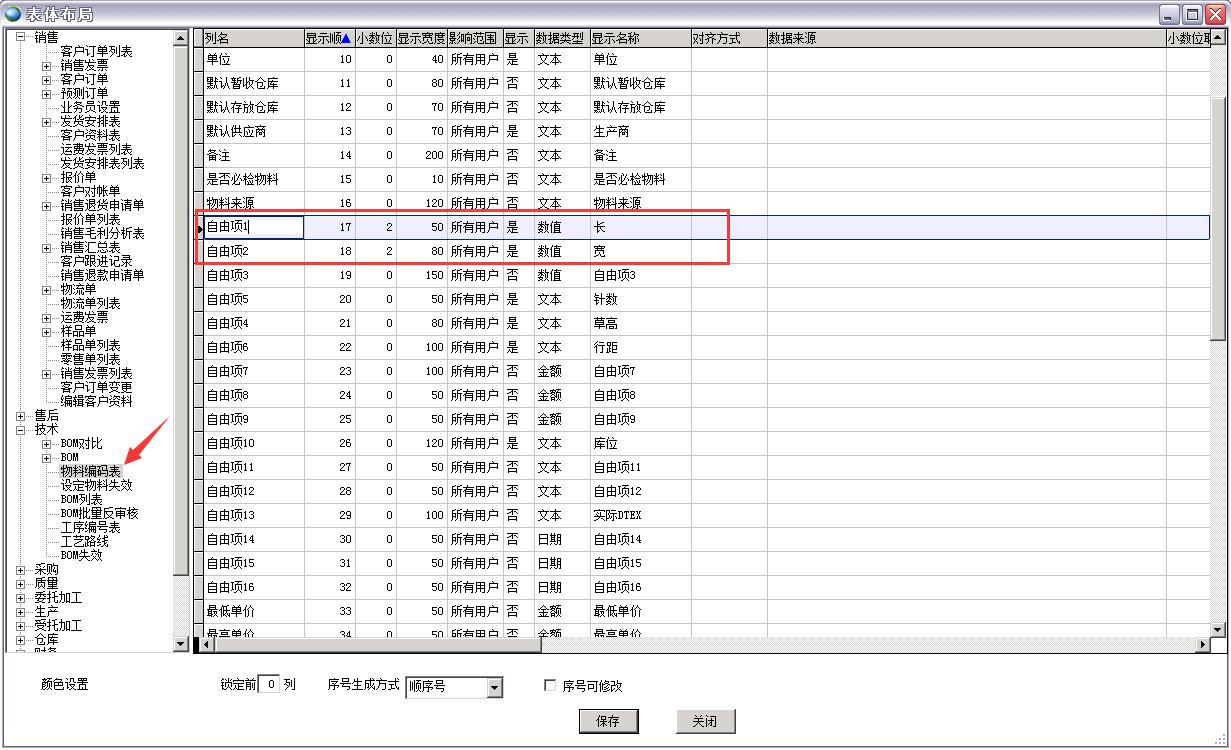 1、物料編碼表的表體布局使用自由項(xiàng)1做為長、自由項(xiàng)2做為寬