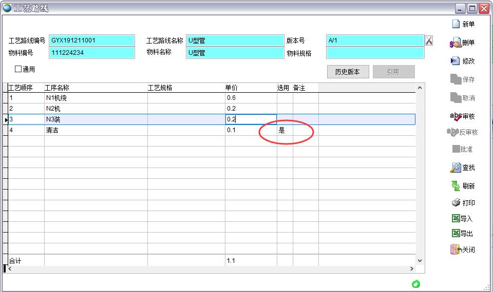 點反審核后版本號會自動加1,前一個版本會自動保存到歷史工藝路線