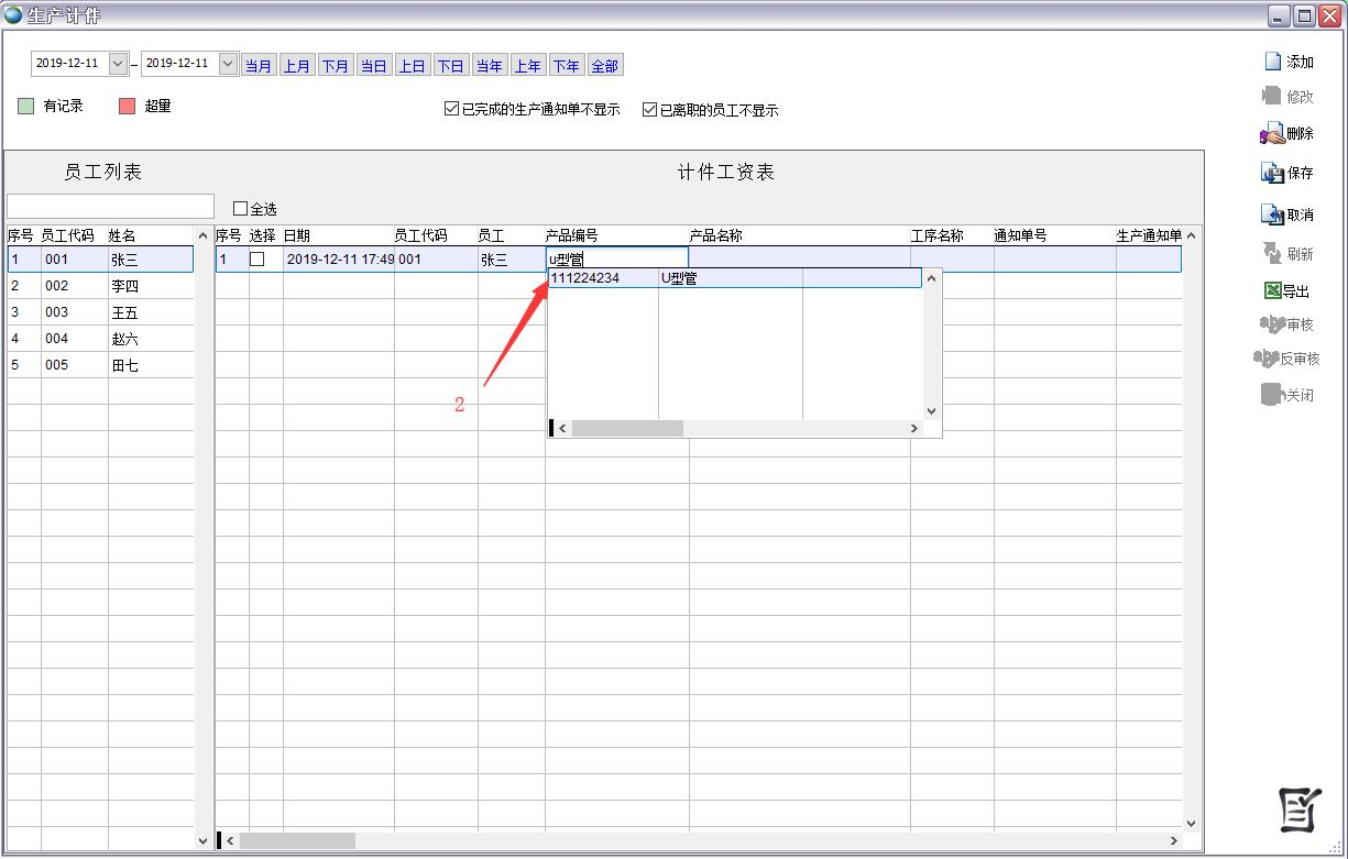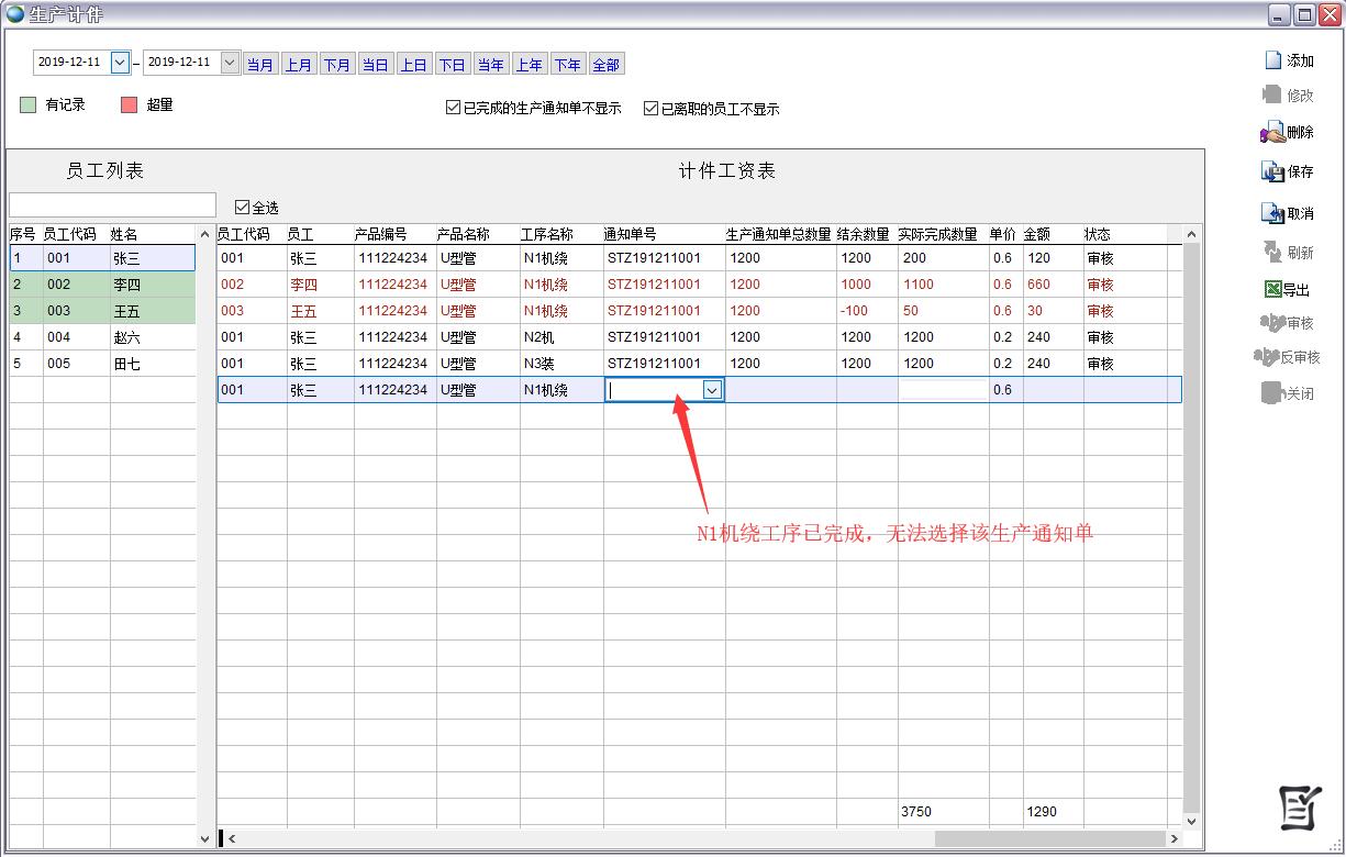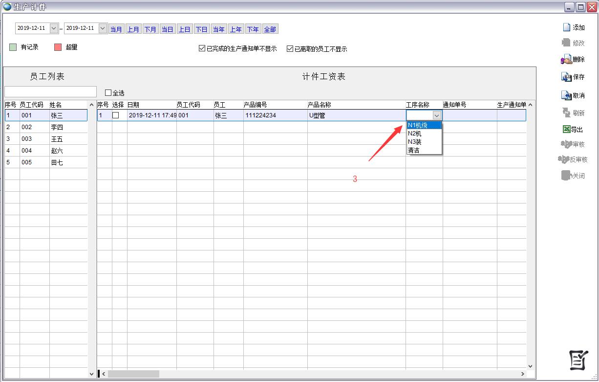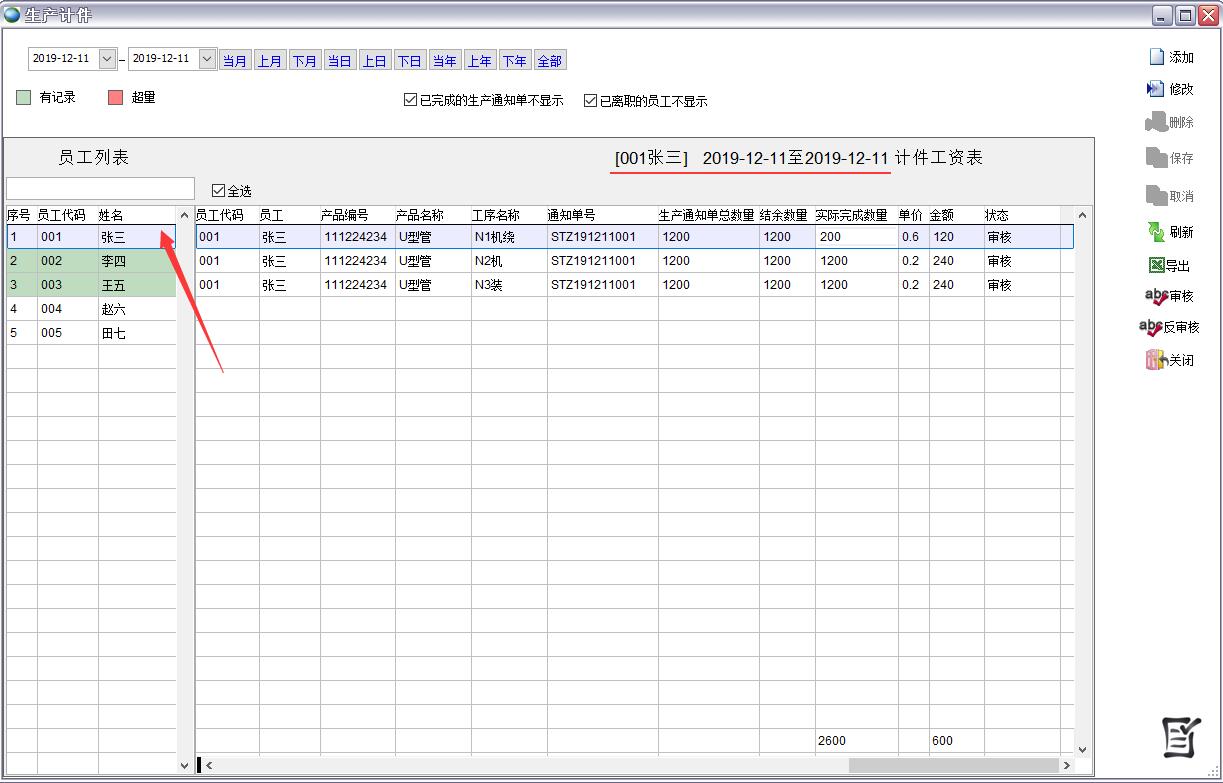 點(diǎn)擊右側(cè)的員工,可以只顯示該員工的生產(chǎn)計(jì)件記錄