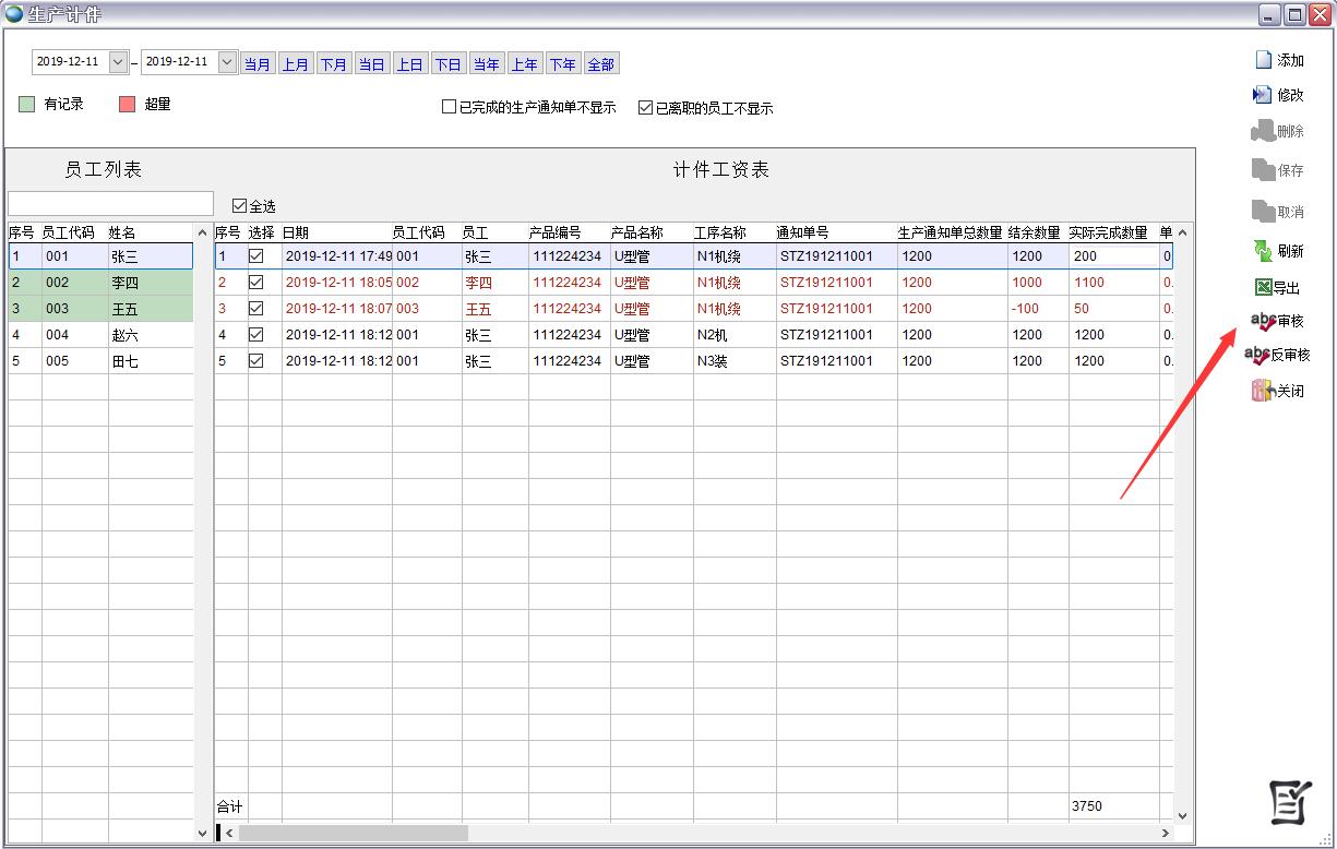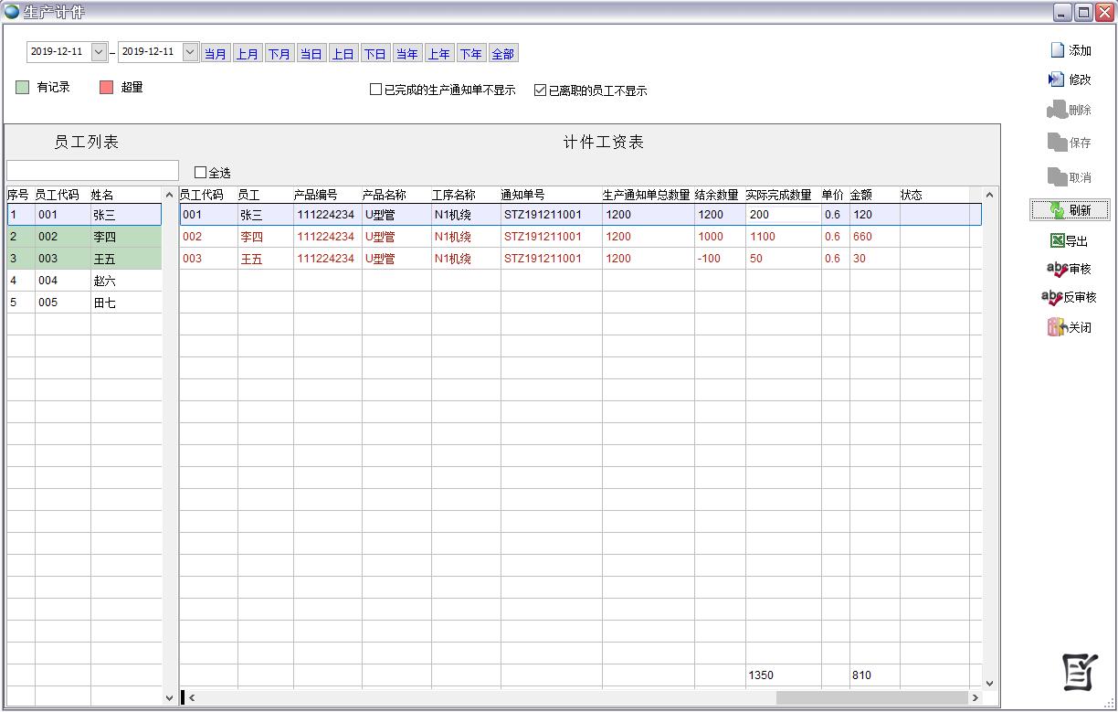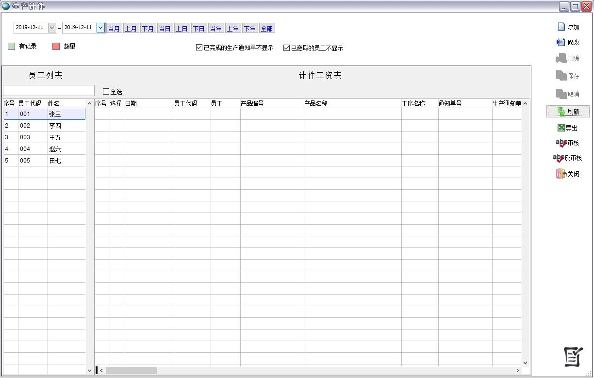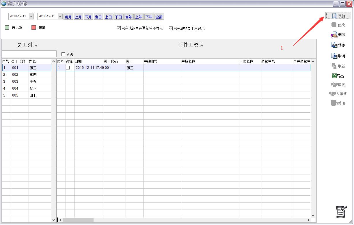 點(diǎn)擊右側(cè)的員工,可以只顯示該員工的生產(chǎn)計(jì)件記錄