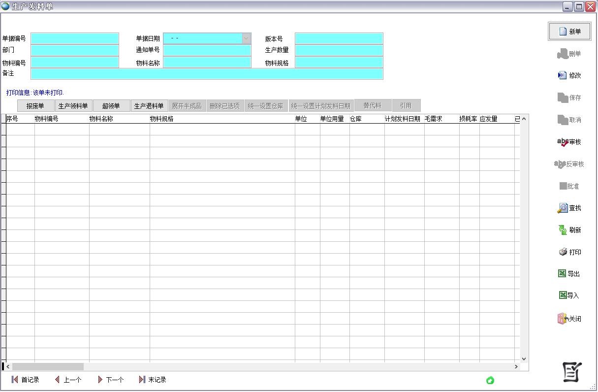 打開路徑:【主菜單】->【計劃】->【生產(chǎn)發(fā)料單】