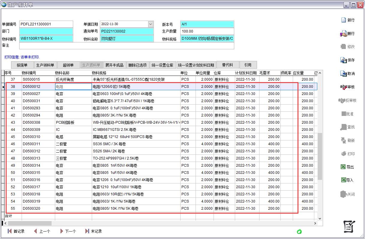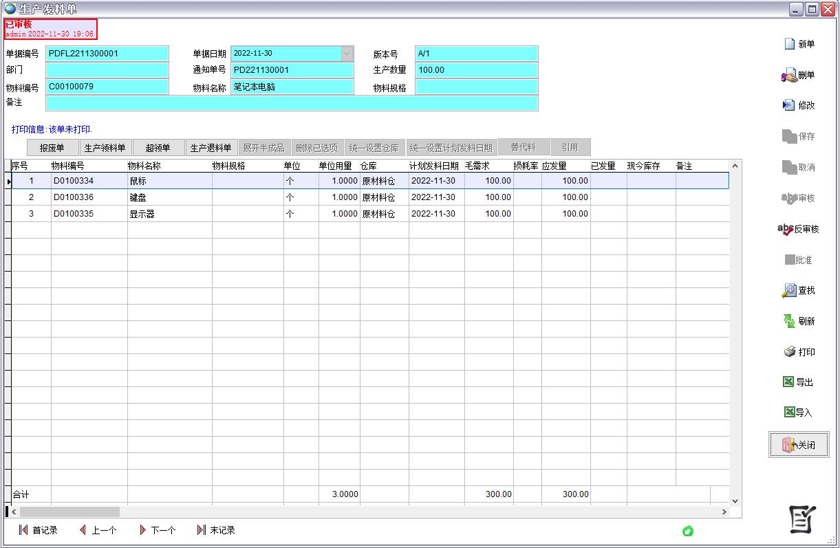 生產(chǎn)發(fā)料單是生產(chǎn)模塊的重要單據(jù),是MRP計算的主要來源單據(jù),下面舉例說明生產(chǎn)發(fā)料單的作用。