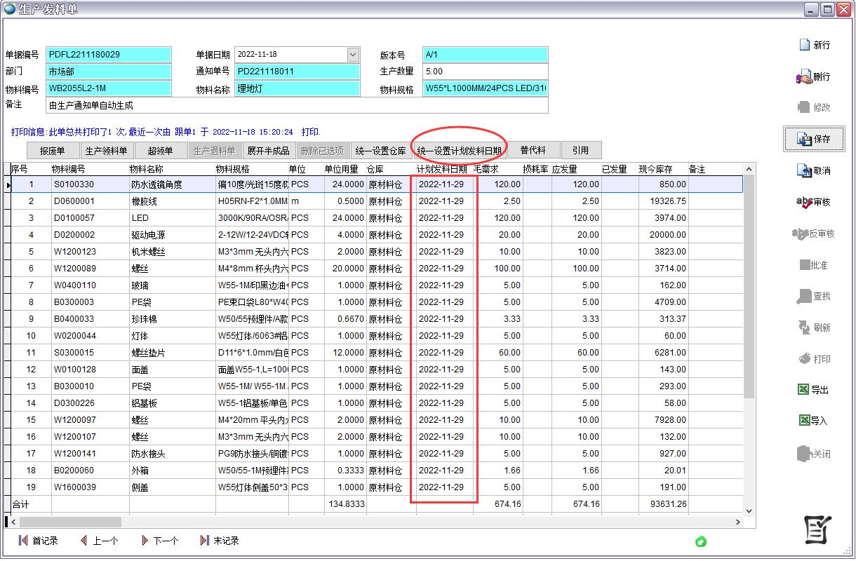 同樣的,如果上千種的物料有些都是需要一次性發(fā)料的,那么也可以通過統(tǒng)一設(shè)置計劃發(fā)料日期來設(shè)置日期。