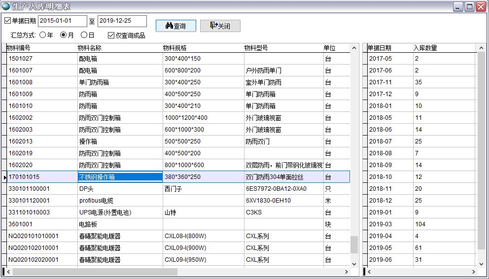 按月匯總 在左側(cè)選擇一行,右側(cè)可以看到該產(chǎn)品每月的入庫數(shù)量