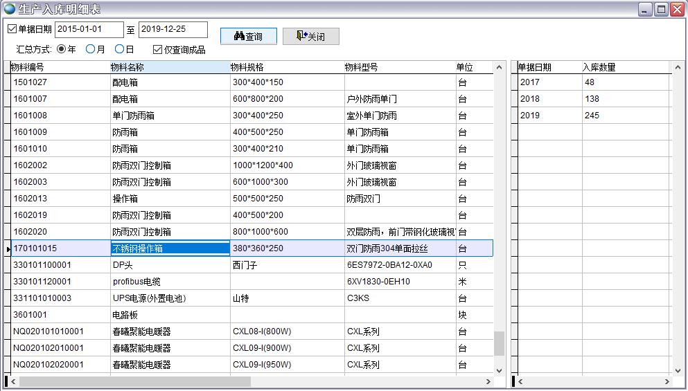 按年匯總 在左側(cè)選擇一行,右側(cè)可以看到該產(chǎn)品每年的入庫數(shù)量