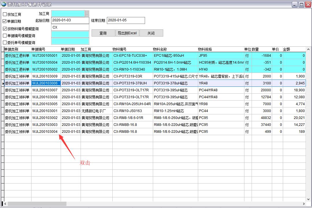 雙擊單據(jù)編號(hào)可以查看委托加工領(lǐng)料單或委托加工退料單明細(xì)
