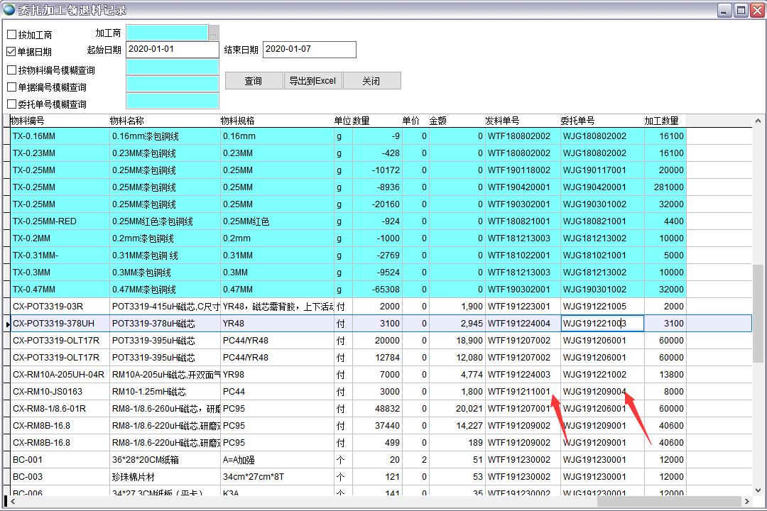雙擊發(fā)料單號(hào)可以查看委托加工發(fā)料單,雙擊委托單號(hào)可以查看委托加工單明細(xì)