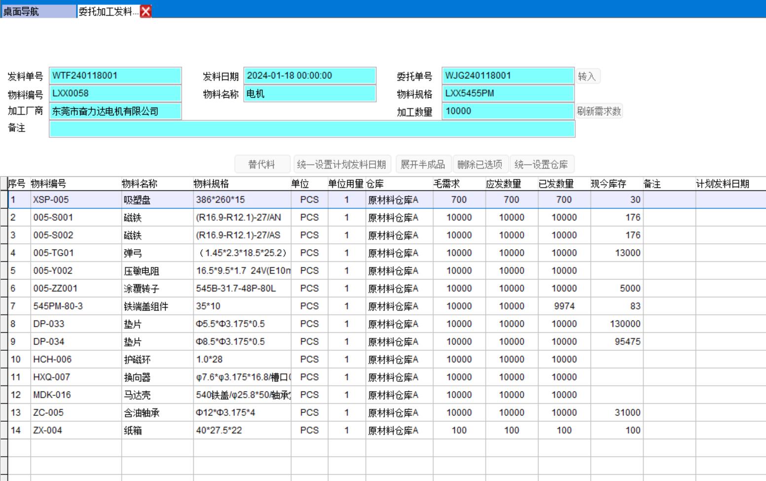 委托加工發(fā)料單會根據(jù)BOM展開所有材料