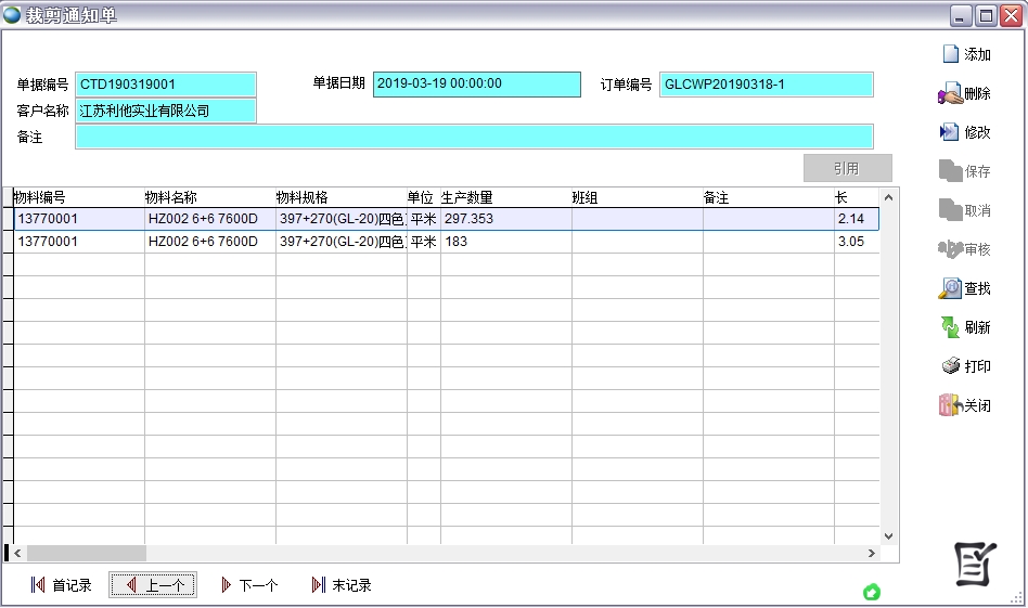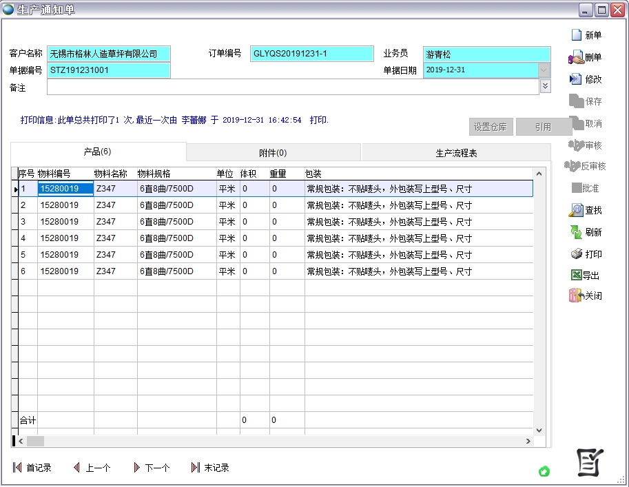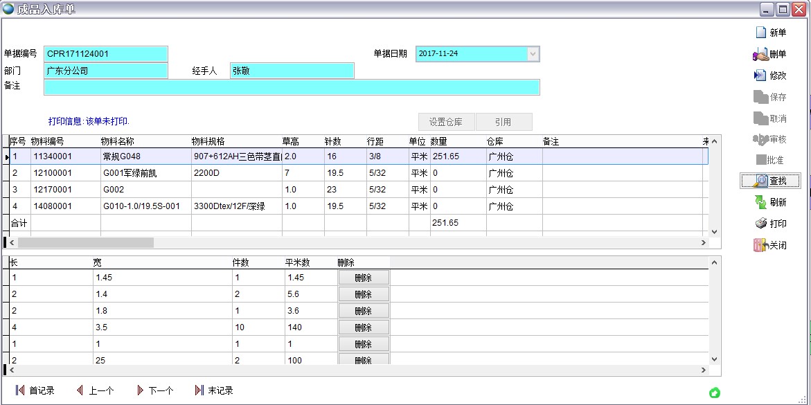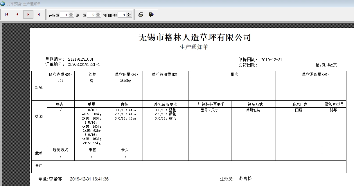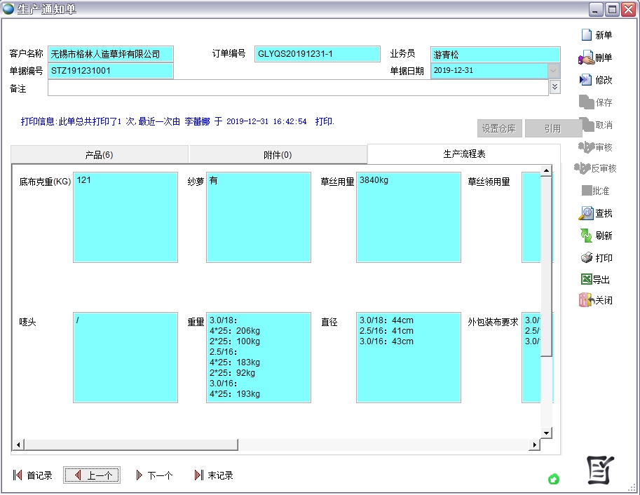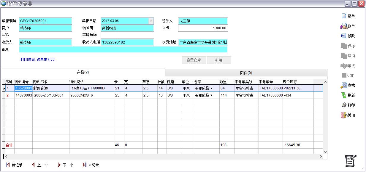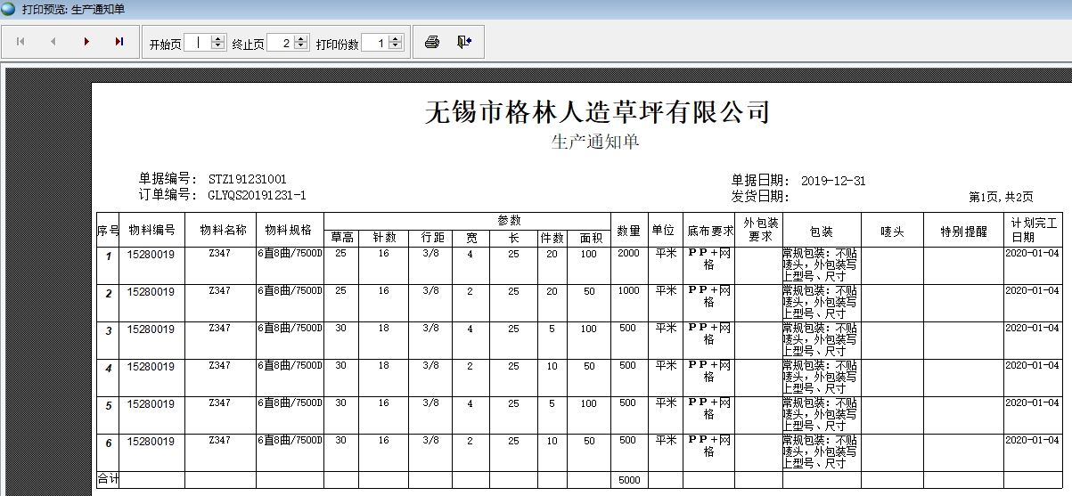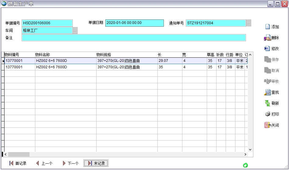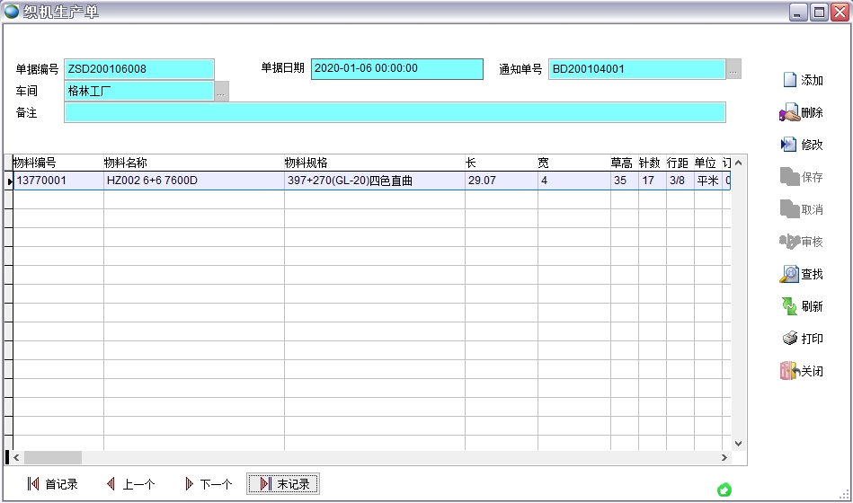 在客戶訂單、生產(chǎn)通知單、銷售發(fā)貨單中都要顯示長、寬、草高、針數(shù)、行距等參數(shù)