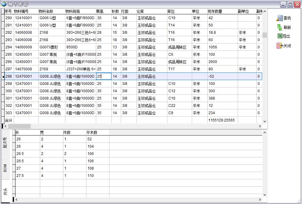人造草坪的產(chǎn)品和主要原材料草絲的類別很多,而且具有特殊的屬性如長、寬、草高、針數(shù)、行距等,同一型號(hào)的產(chǎn)品如果草高、針數(shù)、行距不同則不能混放,因此對(duì)庫存管理要求較高,如果不通過軟件進(jìn)行管理則效率很低也容易出錯(cuò)。