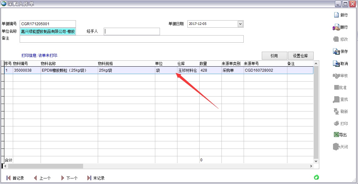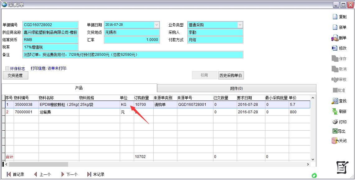 采購單需要使用雙計(jì)量單位,如下圖的橡膠顆粒,采購單上是kg,入庫單時(shí)自動(dòng)換算成袋