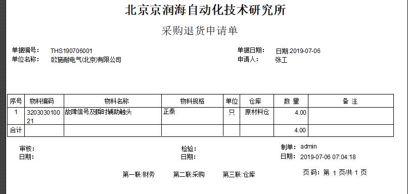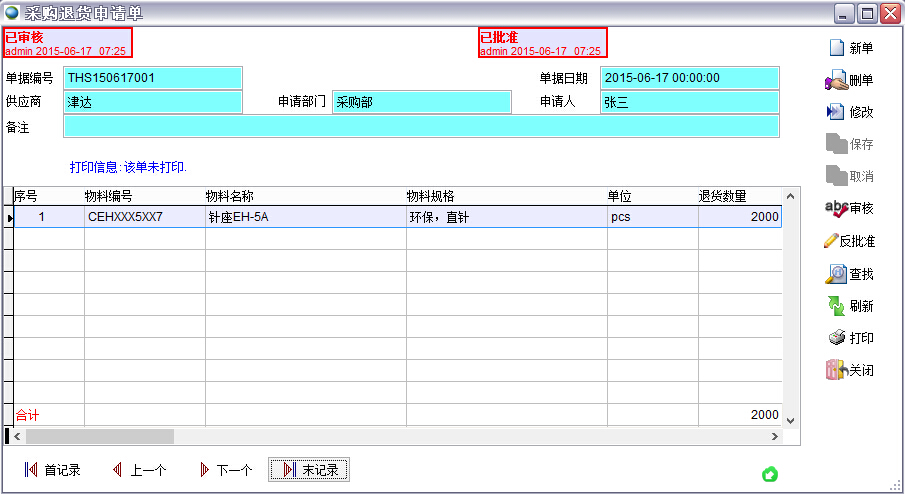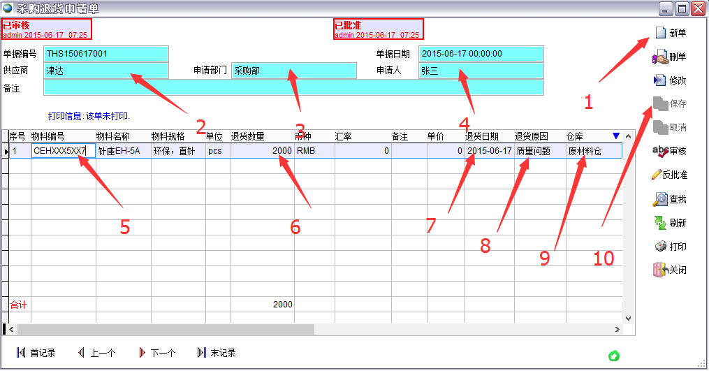 采購?fù)素浬暾垎螢槭止ば略,錄入供?yīng)商及物料所對應(yīng)的編碼生成單據(jù)。采購?fù)素浬暾垎蔚南嚓P(guān)信息會關(guān)聯(lián)到供應(yīng)商交退貨記錄表中。