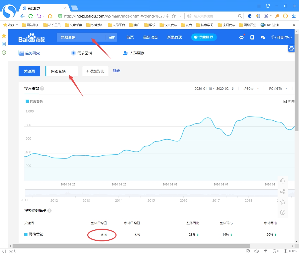 在國內,百度指數搜集的關鍵詞最全面的,可以把要做為標題的關鍵詞在百度指數中搜索,如果沒有這個詞就放棄。另外關鍵詞盡可能日均指數高,比如本站主關鍵詞網絡營銷整體指數614,可以簡單理解為網絡營銷一詞每天在百度被搜索614次。