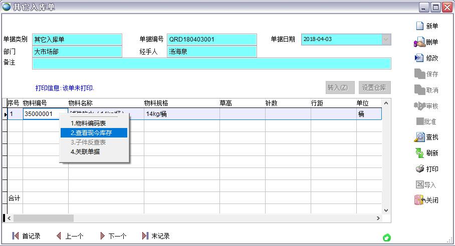 查看庫存 在物料編號中點鼠標右鍵可查看庫存 打印 可通過打印模板修改打印格式 導入 1、點新單 2、點導入 3、格式必須按安裝目錄\數(shù)據(jù)導入模板\其他入庫單.xls格式 4、導入后 入庫單價和金額 如果沒有出現(xiàn)單價和金額,可以在表體布局中設(shè)置 由于沒有引用任何單據(jù),其它入庫單單價需手工填寫 也可以不直接在其它入庫單中填寫單價,比如其它入庫單是由倉庫制單,但倉庫不知道單價多少,倉庫只管數(shù)量 其它入庫單制單后,由財務在入庫單金額維護中補上單價