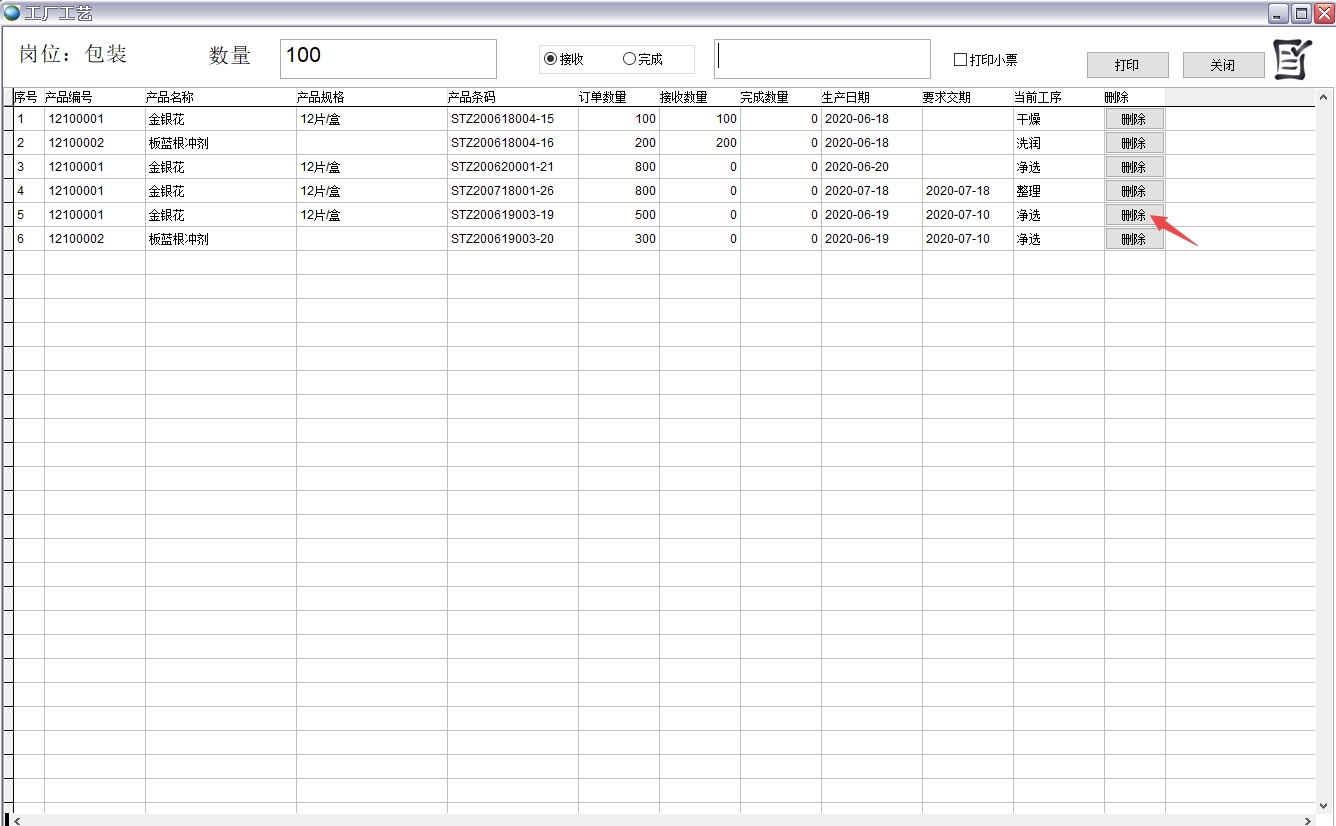 語音播報 掃碼完成后會有語音提示:'接收'或者'完成' 如果同一個產(chǎn)品條碼重復(fù)掃會有語音提示'重復(fù)' 如果該條碼不在列表中會語音提示'不在本崗位' 跳過本工序 工序掃碼是有順序的,即前一道工序沒有掃碼,后一道工序就無法掃。有時候需要跳過本工序的可以點刪除,這樣下道工序就可以接著掃碼 相關(guān)知識 工序掃碼