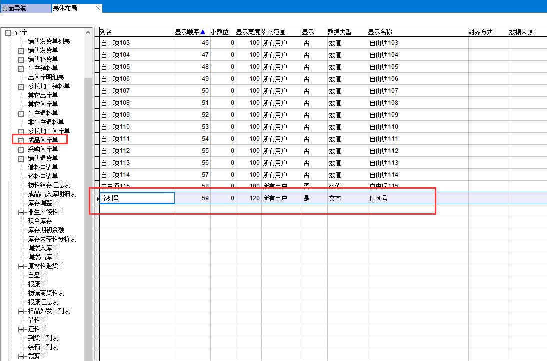 表體布局中將序列號字段顯示出來,默認(rèn)為不顯示