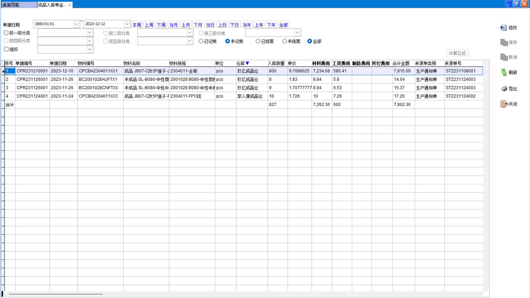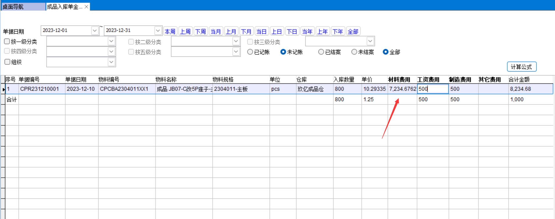 打開路徑:【主菜單】-【存貨核算】-【成品入庫單金額維護】