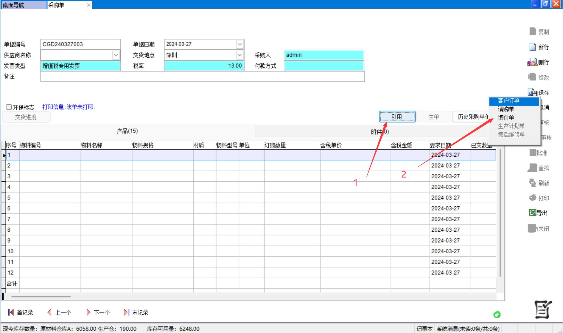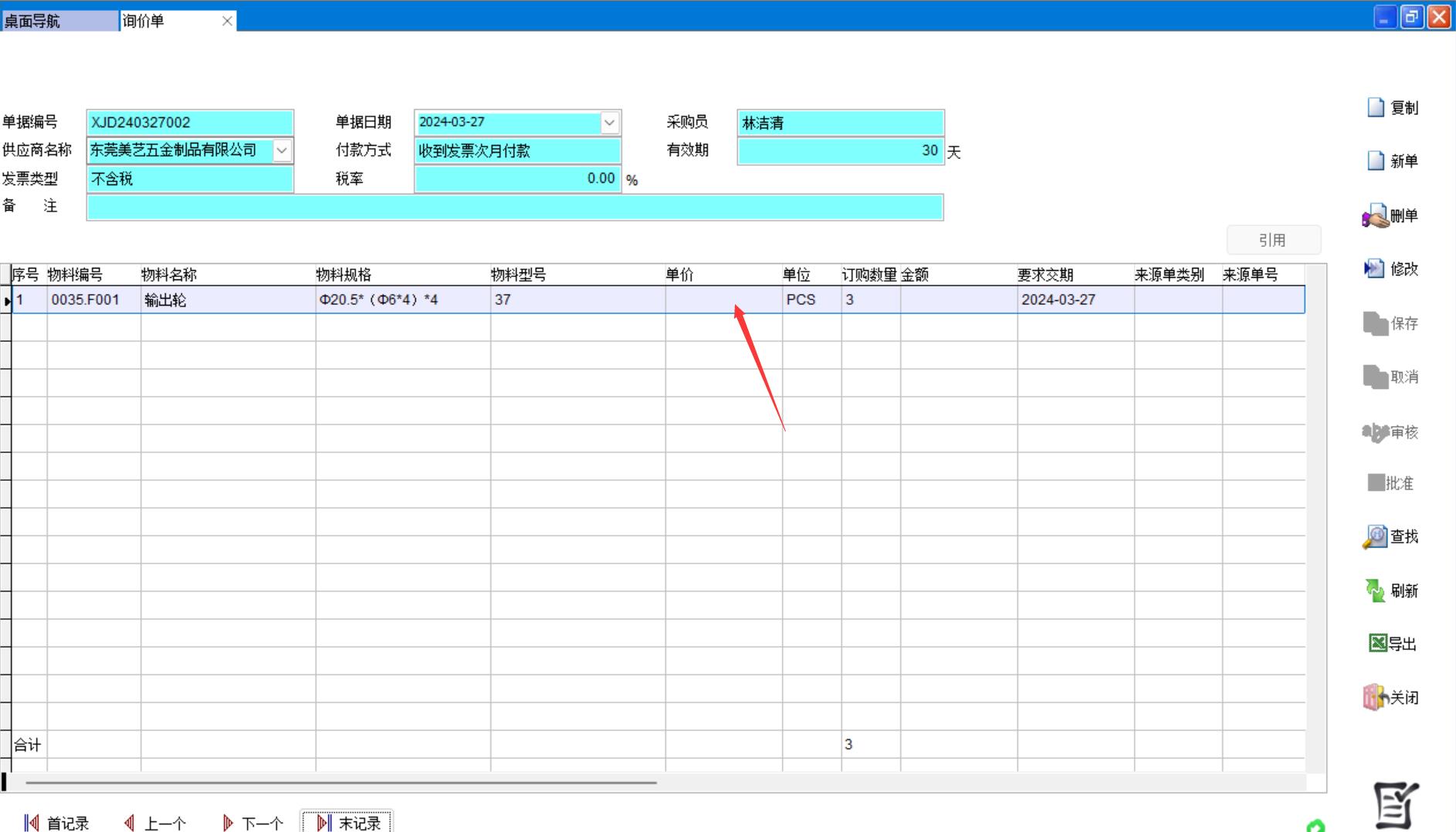 2、選擇物料,輸入數(shù)量、單價(jià)、要求交期