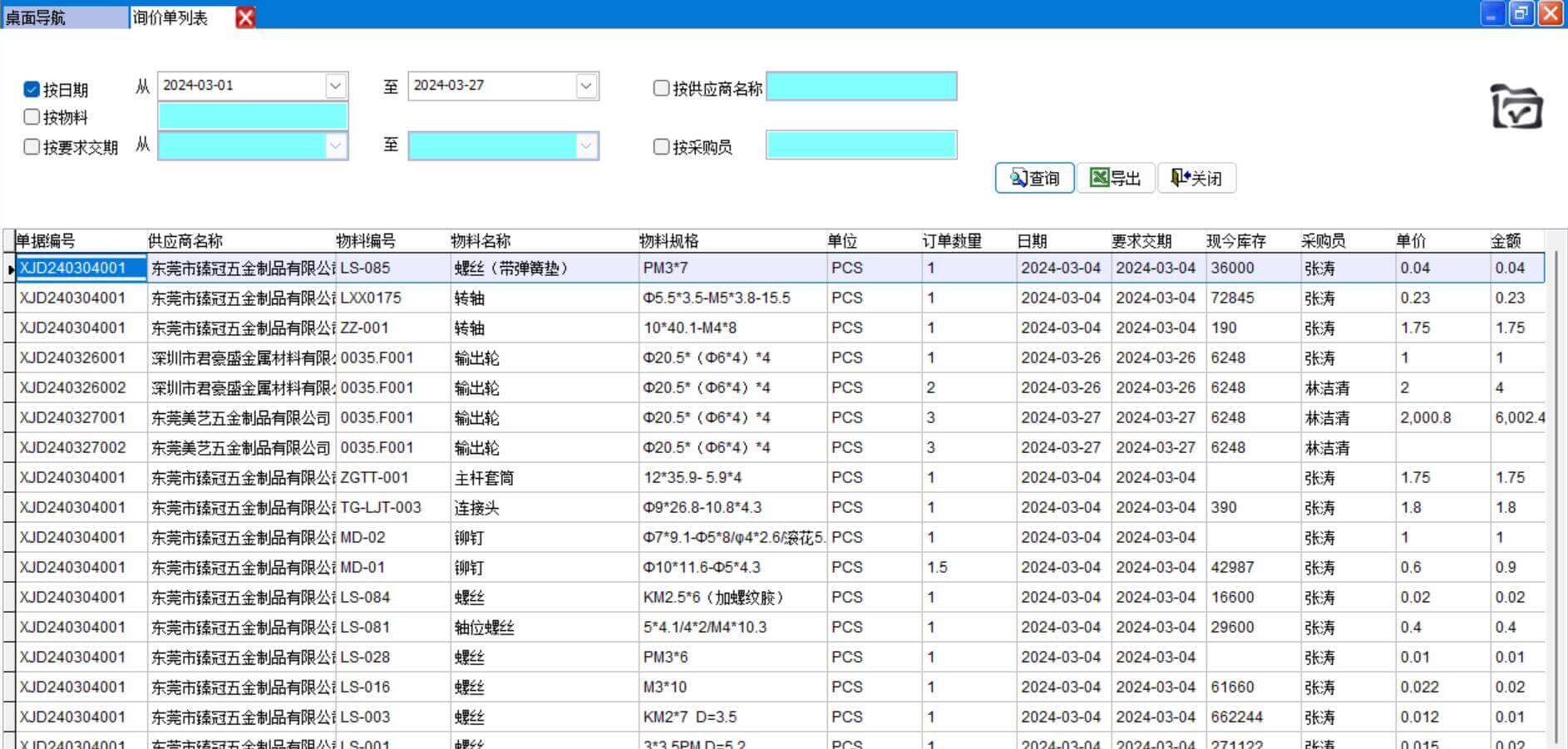 所有詢價(jià)單的統(tǒng)計(jì)表,可以按供應(yīng)商名稱、物料、詢價(jià)單日期、采購員、要求交期查詢