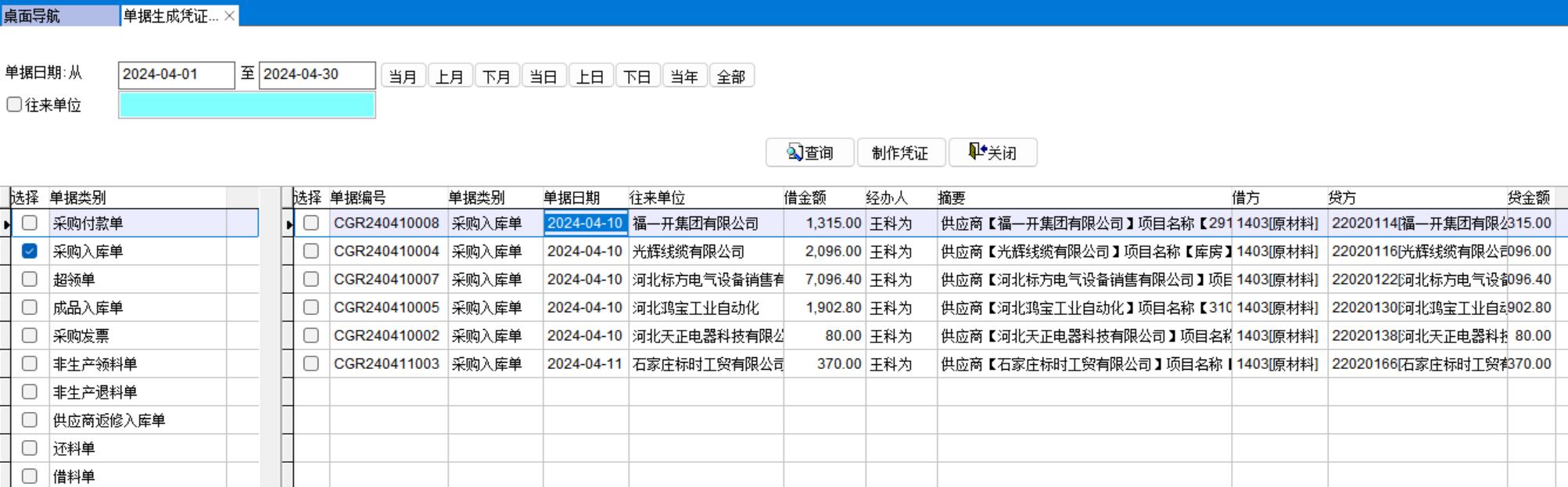 采購入庫單可以自動生成憑證,也可以手工批量生成憑證。