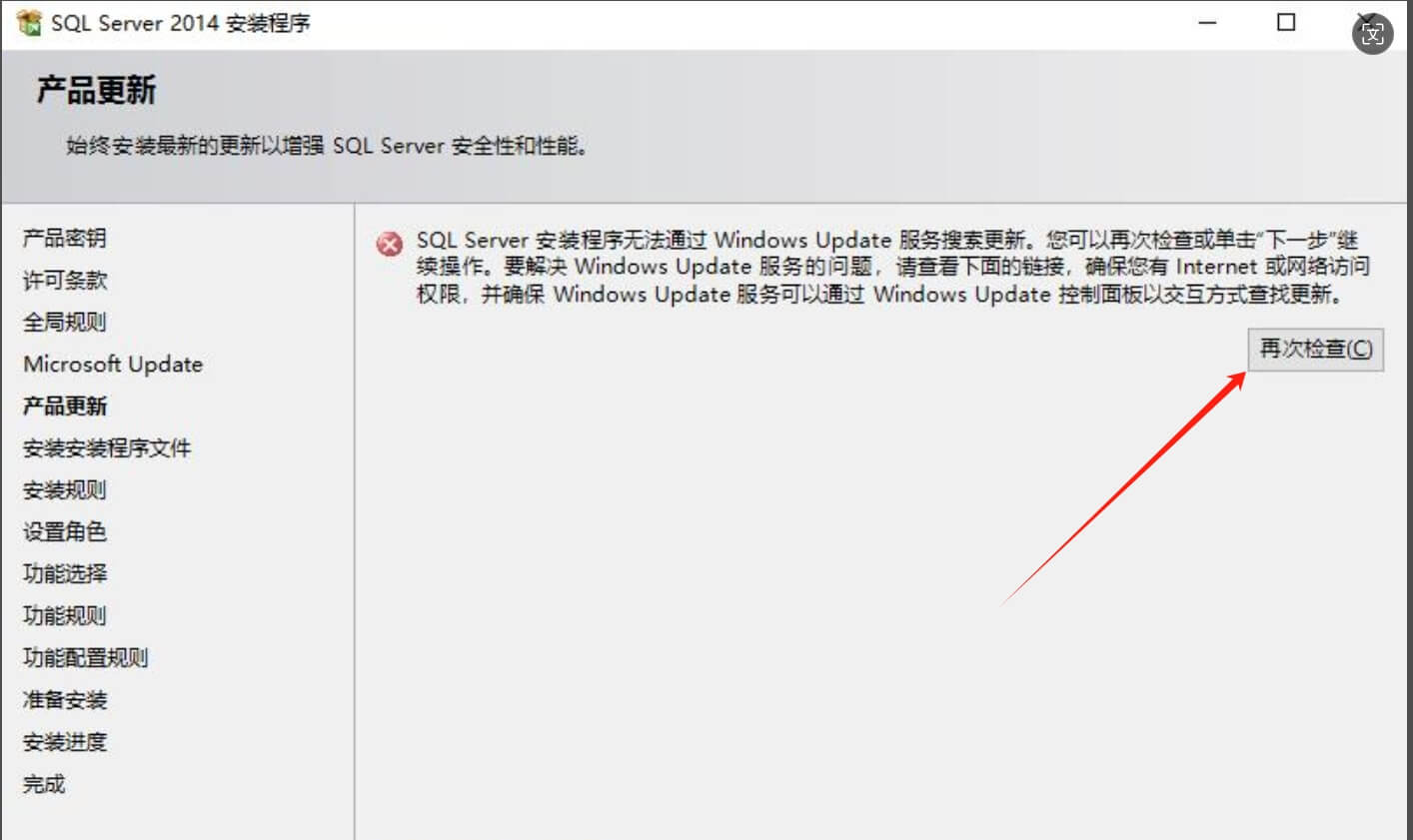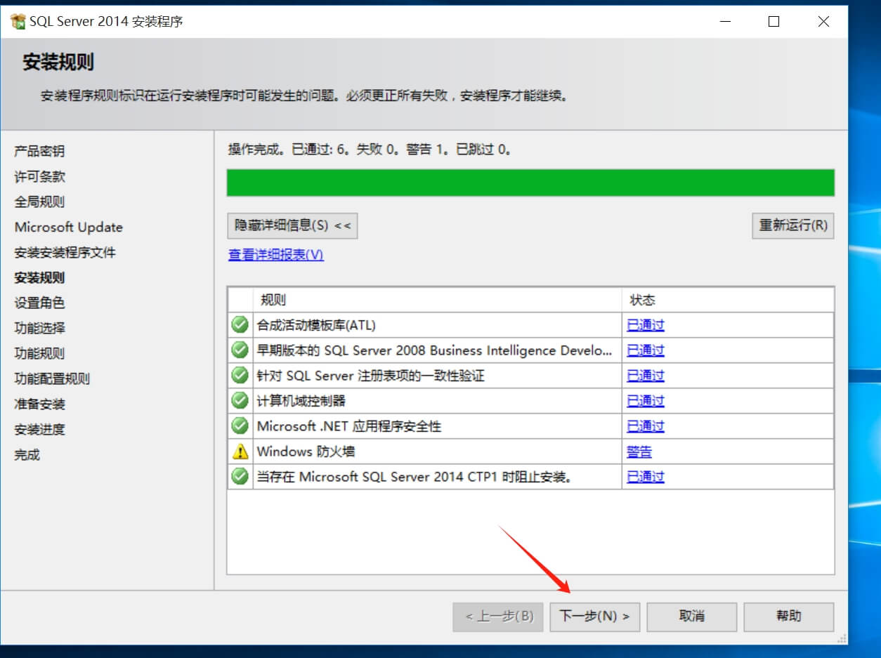 再回到SQL2014安裝界面,點重新檢查,此時錯誤警告已經(jīng)消除了,點下一步