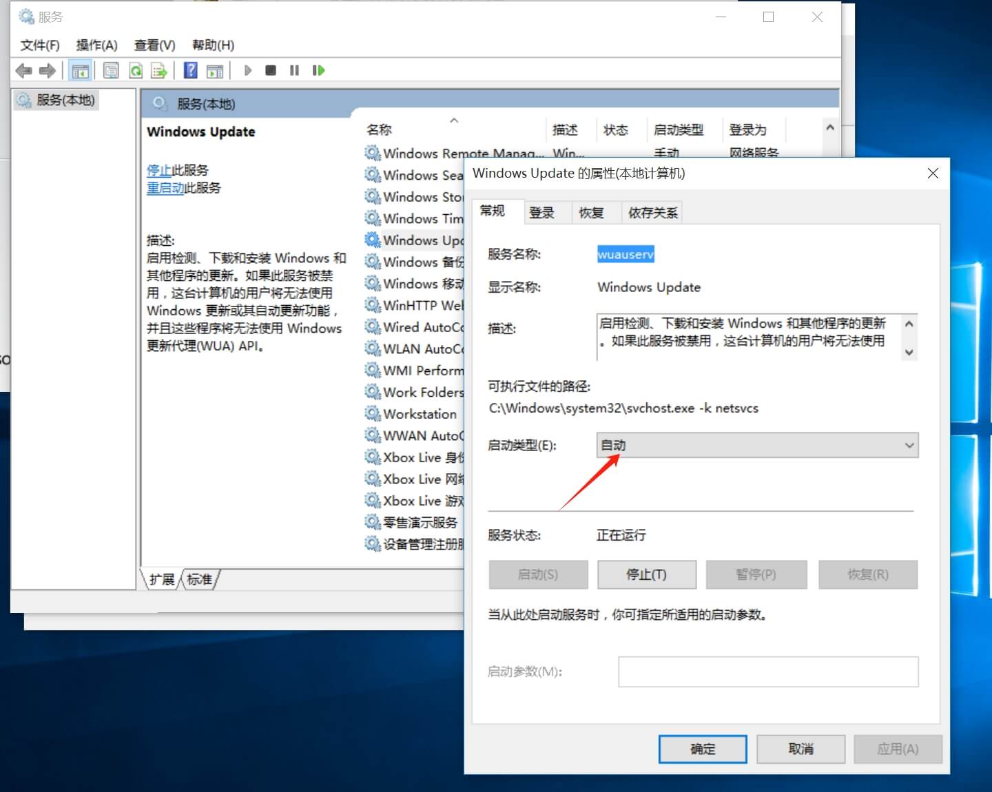 進入服務(wù),找到windows update,啟動類型:自動,服務(wù)狀態(tài):啟動