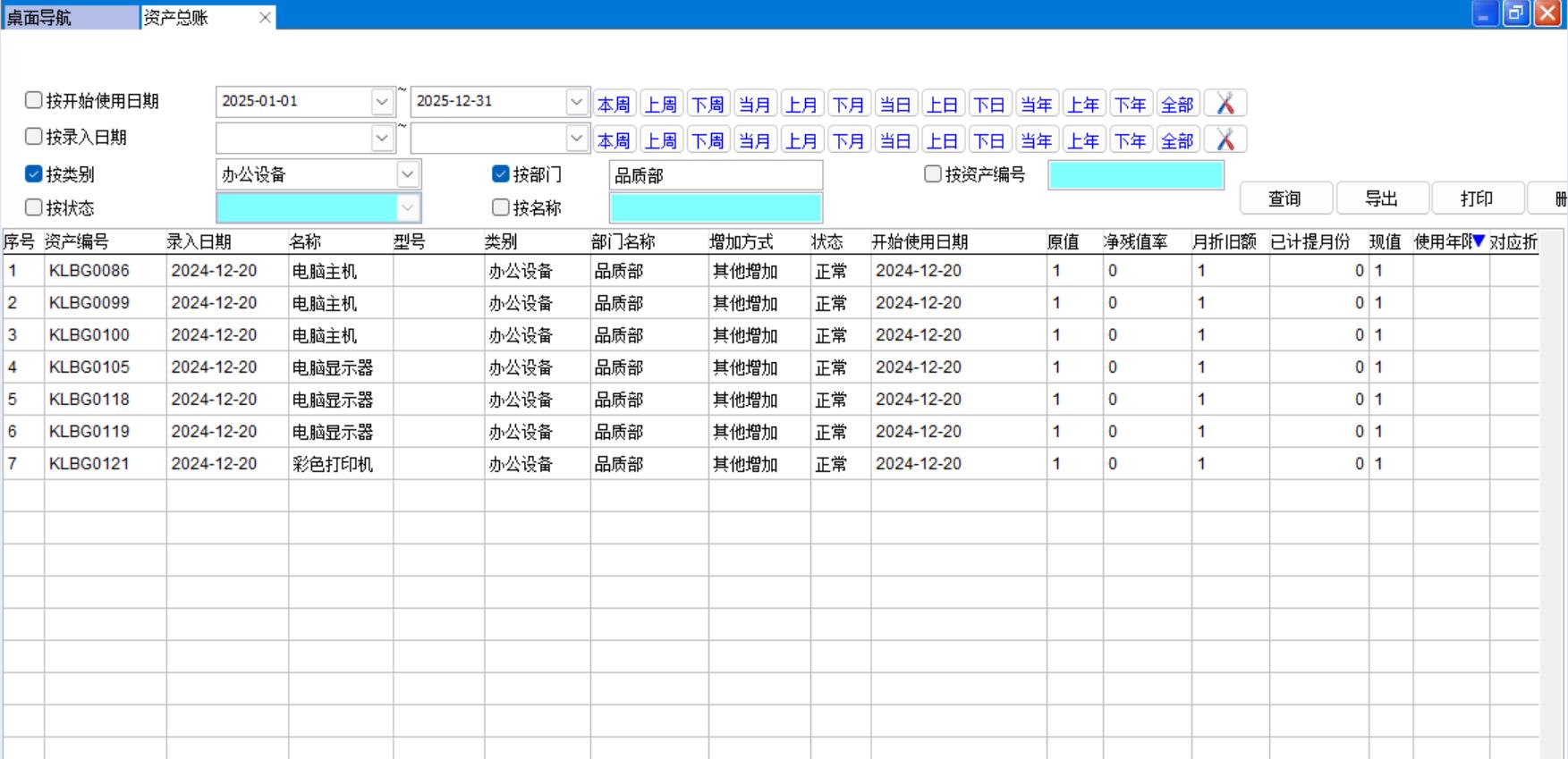 資產(chǎn)總賬可以通過(guò)類(lèi)別、歸屬部門(mén)、狀態(tài)(正常、維修、報(bào)廢)、資產(chǎn)名稱(chēng)、資產(chǎn)編號(hào)進(jìn)行查詢(xún)。