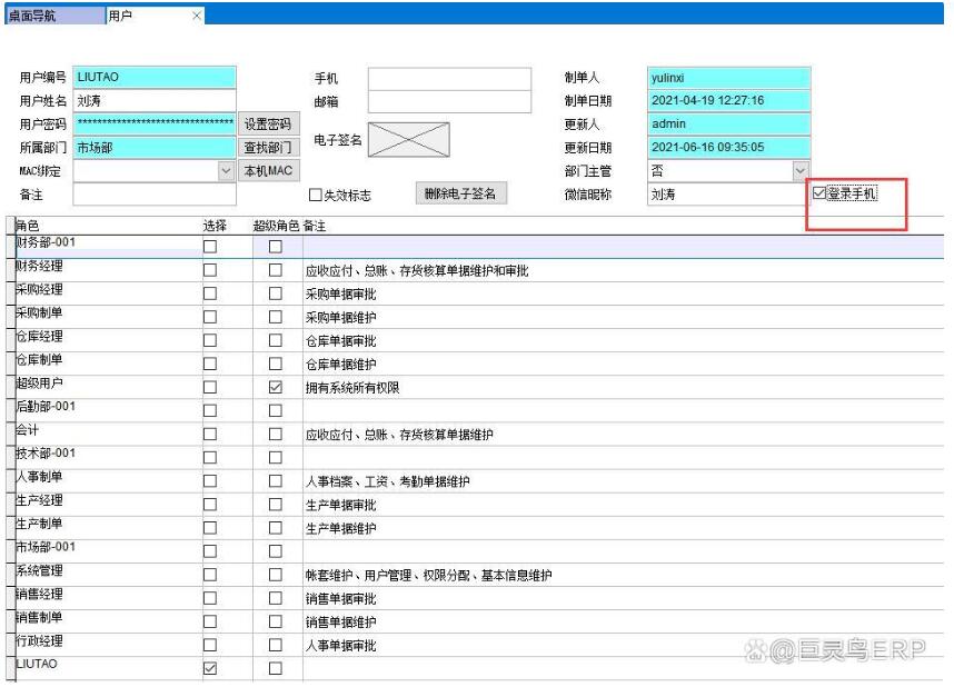 所有單據(jù)都可以設(shè)置權(quán)限,權(quán)限在電腦端設(shè)置,比如設(shè)置某用戶允許登錄手機端