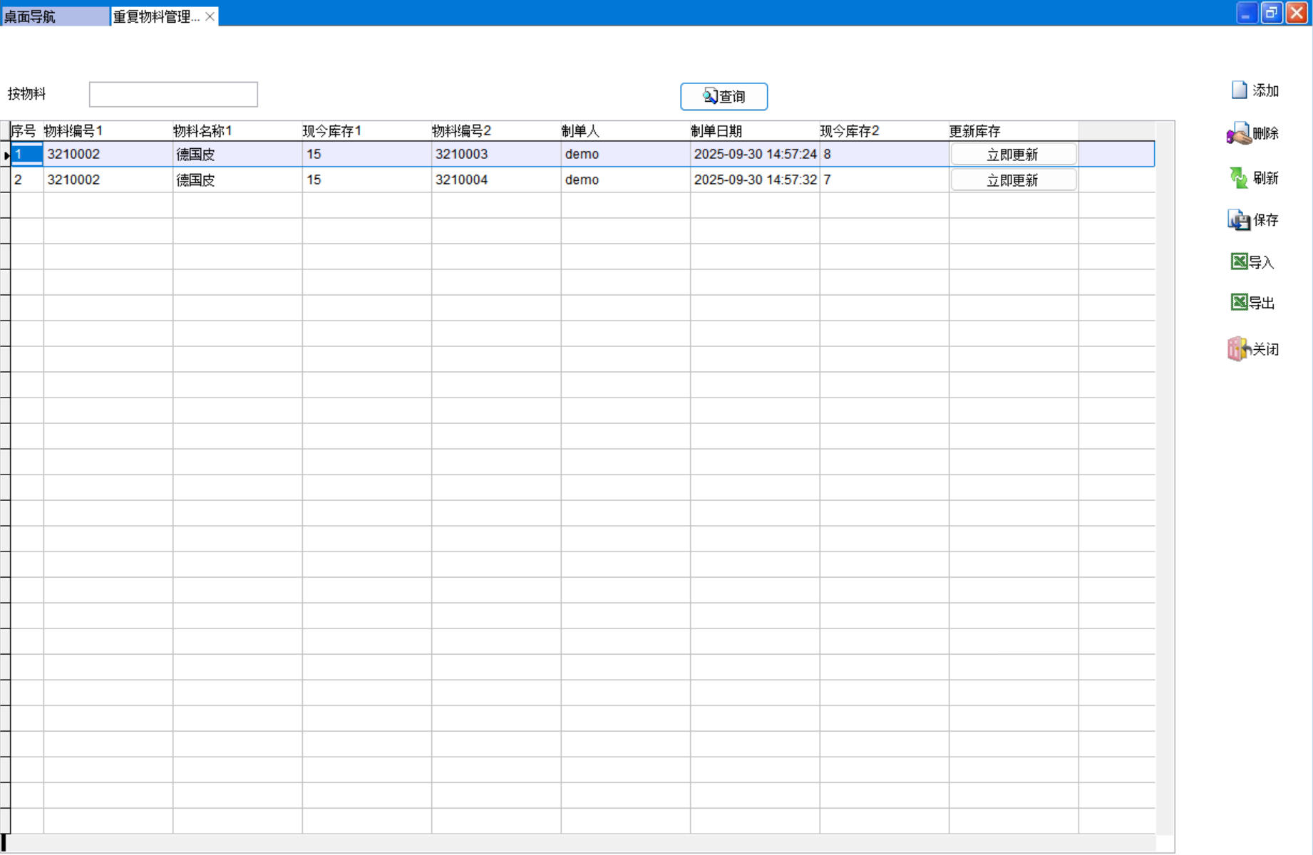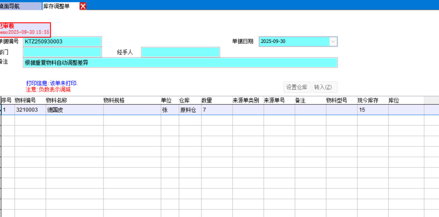 點(diǎn)立即更新后系統(tǒng)會(huì)自動(dòng)生成一個(gè)庫(kù)存調(diào)整單,將物料編號(hào)2的庫(kù)存數(shù)量調(diào)整和物料編號(hào)1一致。
