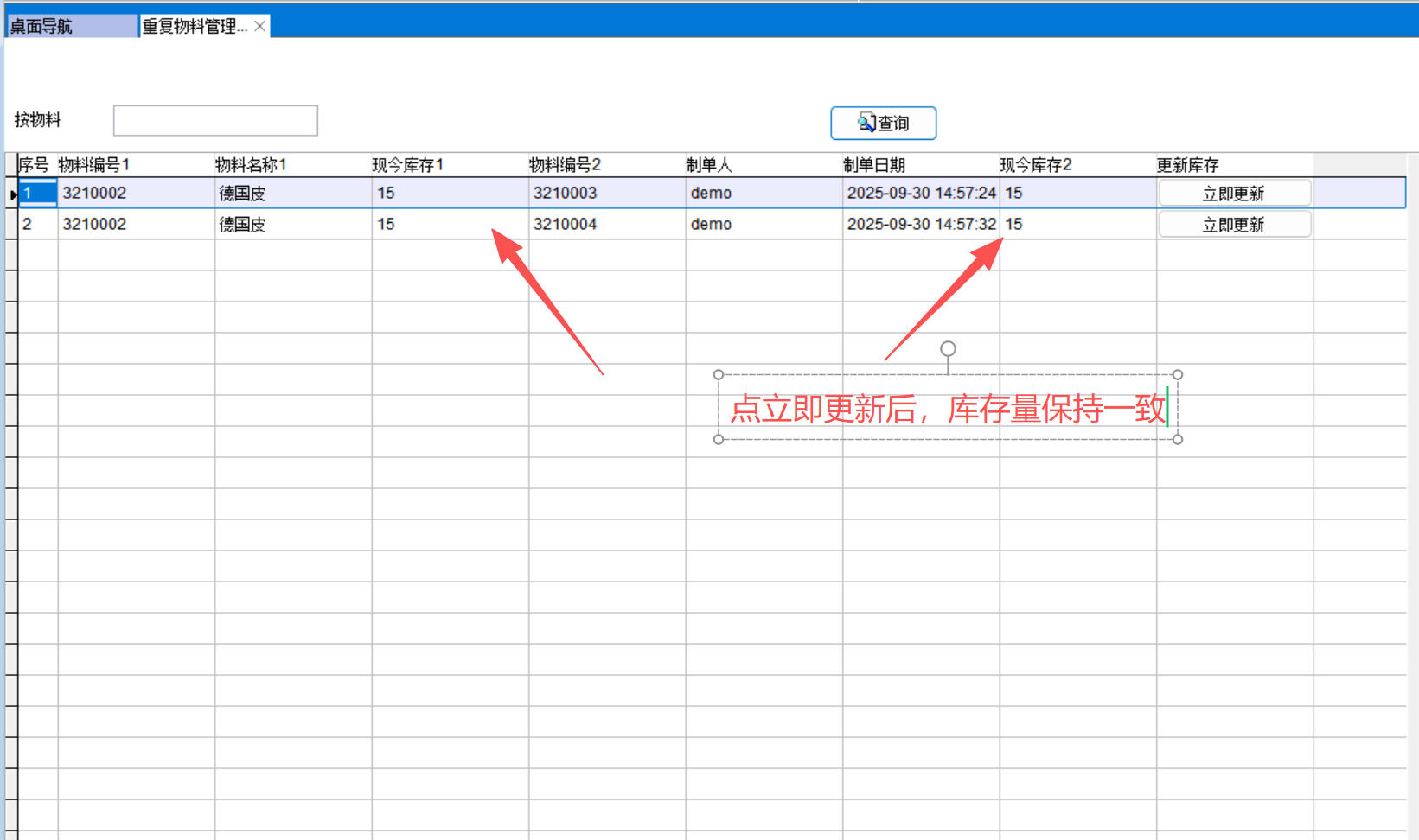 如上圖所示,3210002、3210003、3210004是同一個(gè)物料,名稱(chēng)都相同,保存后在更新庫(kù)存上點(diǎn)立即更新,更新后3個(gè)物料的庫(kù)存就會(huì)保持一致,以后任意一個(gè)物料的出入庫(kù)后,其他兩個(gè)物料也會(huì)同步庫(kù)存量。3個(gè)物料會(huì)始終保持庫(kù)存一致。