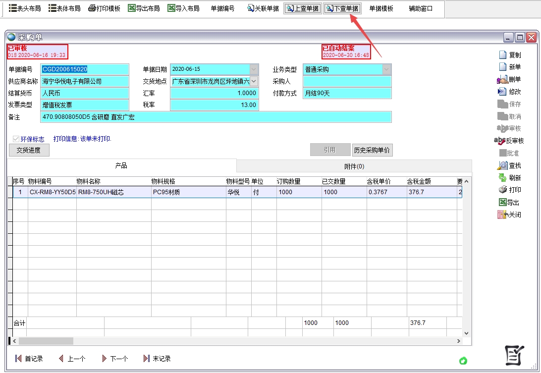 打開任一單據(jù),如下圖的采購入庫單,點(diǎn)擊上查單據(jù)可看到此采購入庫單來源于采購單