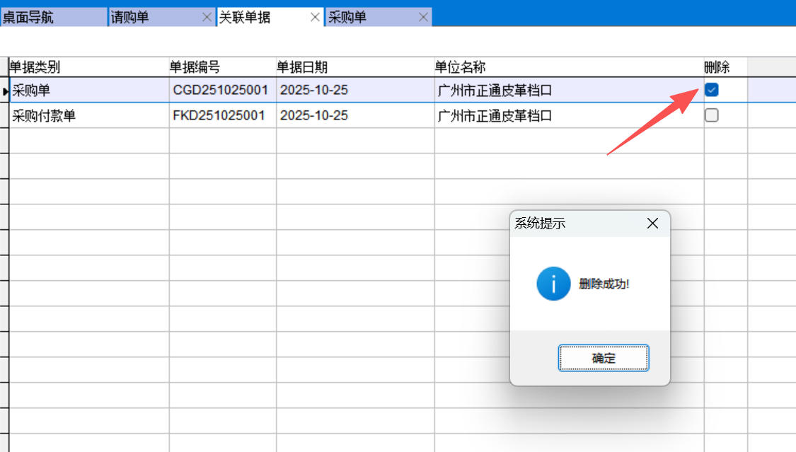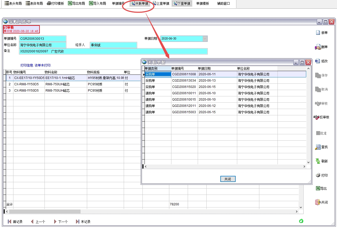 點(diǎn)擊關(guān)聯(lián)單據(jù)列出當(dāng)前系統(tǒng)中存在的與此單據(jù)關(guān)聯(lián)的所有單據(jù)