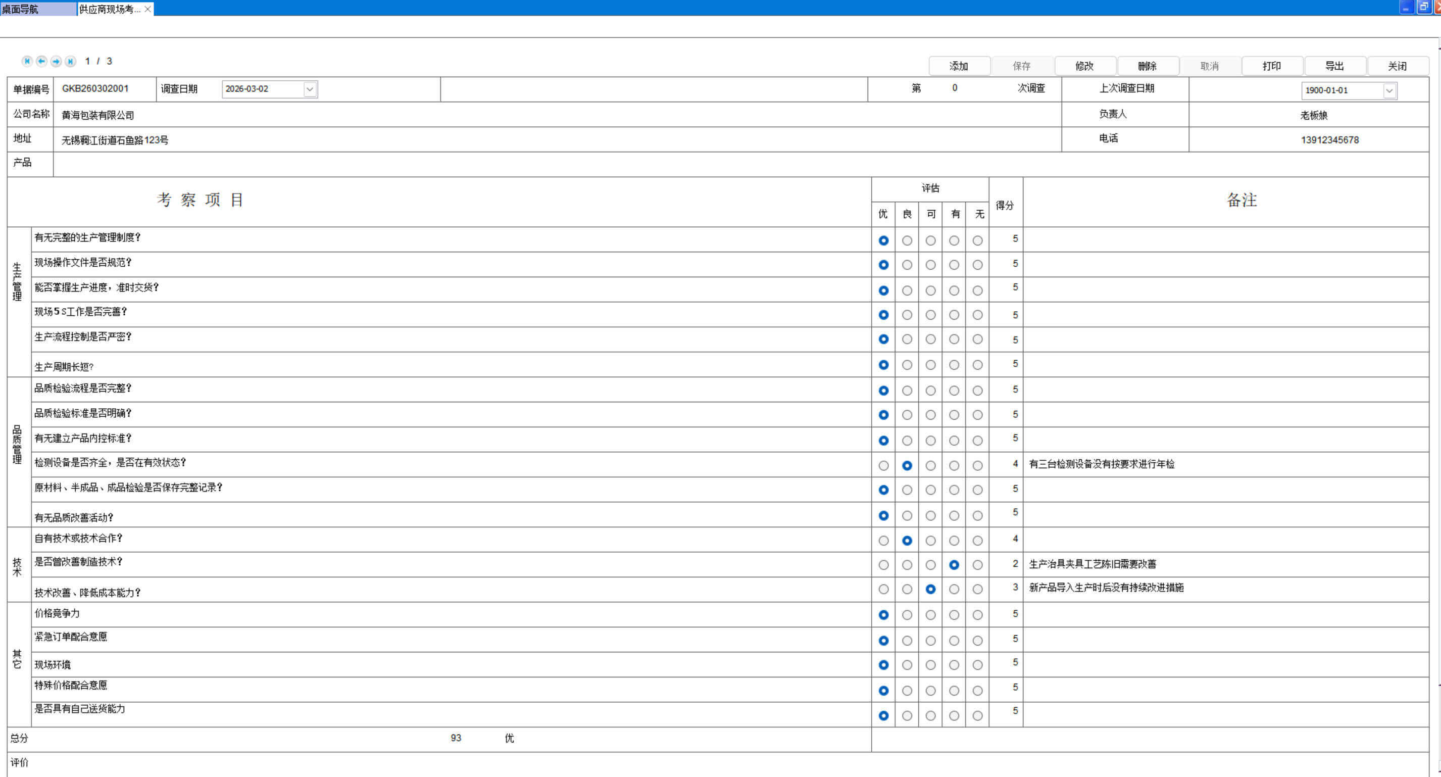 打開(kāi)路徑:【主菜單】-【采購(gòu)】-【供應(yīng)商評(píng)審】 -【供應(yīng)商現(xiàn)場(chǎng)考察表】