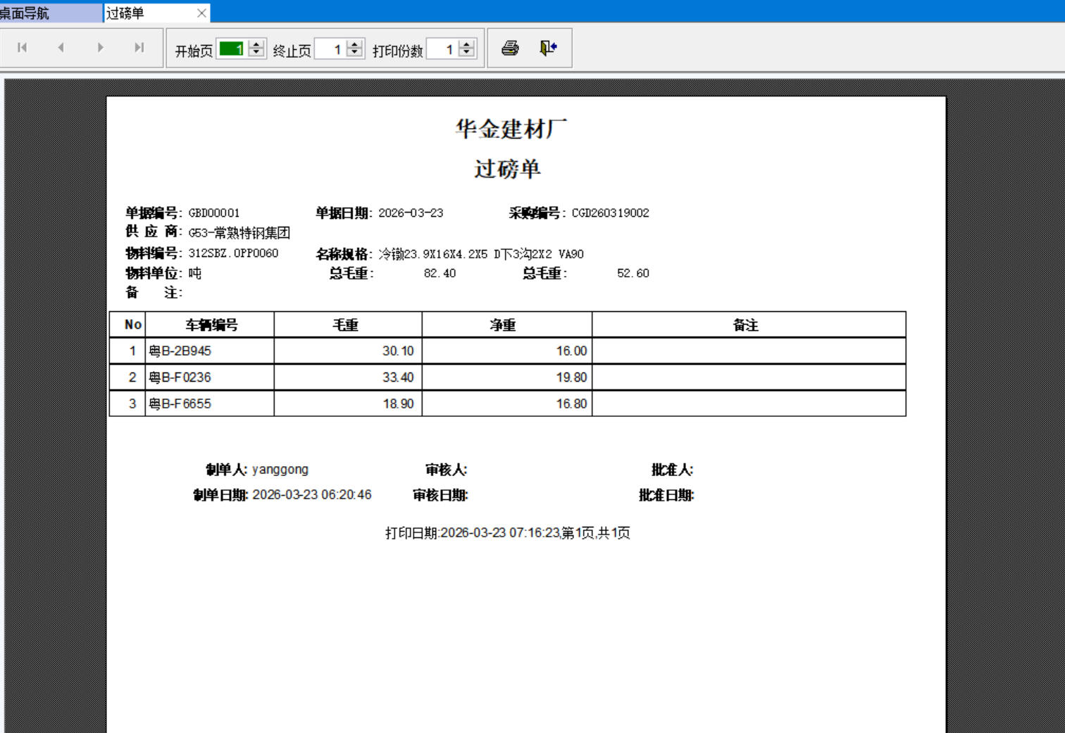 過磅單用于記錄車輛在地磅稱重過程中的重量信息。首先需要將地磅通過RS485/232或modbus接口與ERP系統(tǒng)連接,這樣ERP系統(tǒng)才能讀到地磅的稱重數(shù)據(jù),不同的地磅品牌通訊協(xié)議會不同,需要聯(lián)系地磅生產(chǎn)商詢問是否支持接口連接。其次在地磅前端可以安裝攝像頭捕捉車牌號自動錄入到ERP系統(tǒng)中,如果沒有連攝像頭那就手工輸入車牌號。