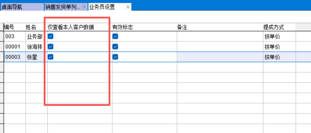 如果允許業(yè)務(wù)員也能看到銷售發(fā)貨單列表,但是僅能查看本人的發(fā)貨記錄,可以在業(yè)務(wù)員設(shè)置中設(shè)置下權(quán)限