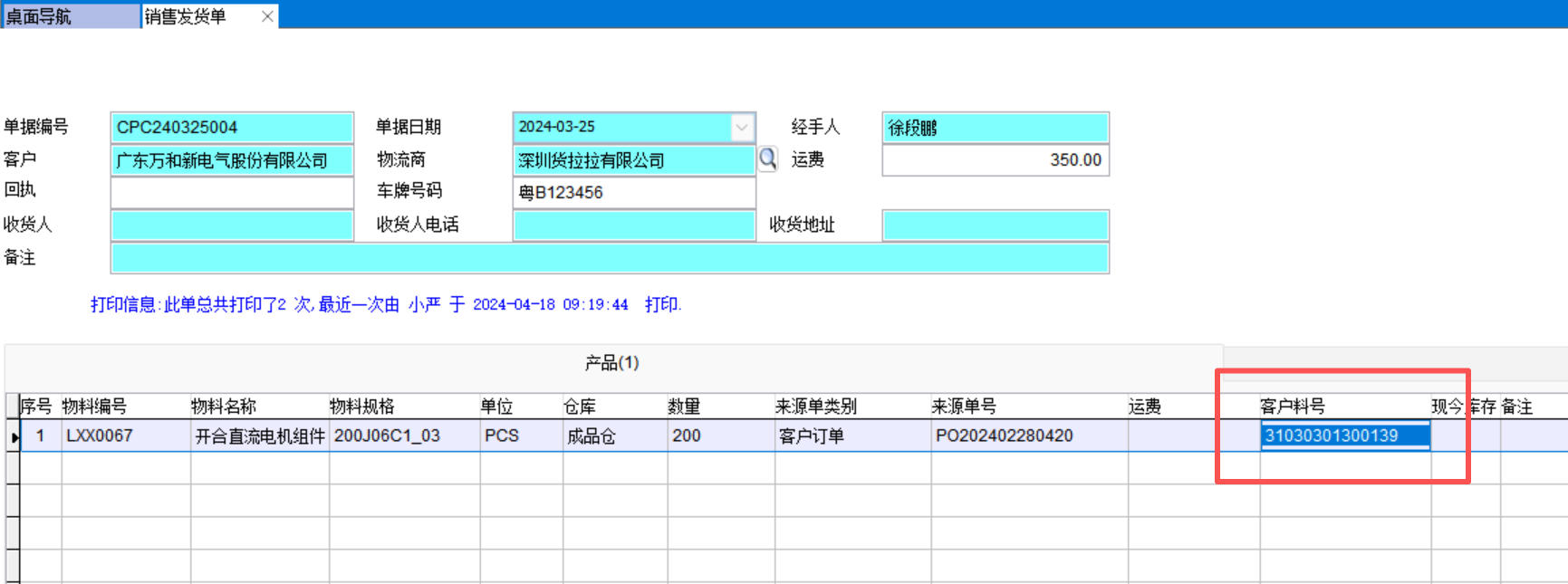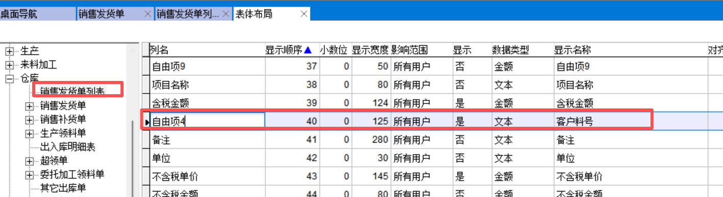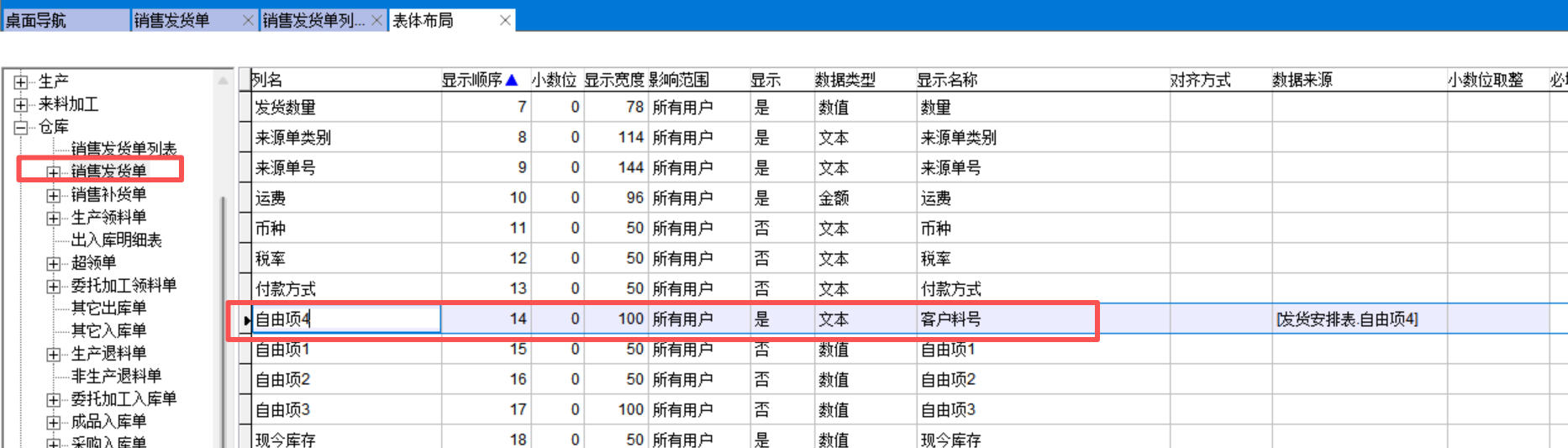 銷售發(fā)貨單中的自由項(xiàng)也可以在銷售發(fā)貨單列表中顯示,比如下圖的客戶料號(hào)