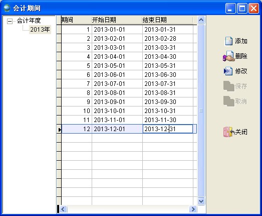 在新建帳套后,此帳套的當(dāng)年剩余的會(huì)計(jì)期間會(huì)自動(dòng)建立,如下圖,2013年11月1日新建帳套