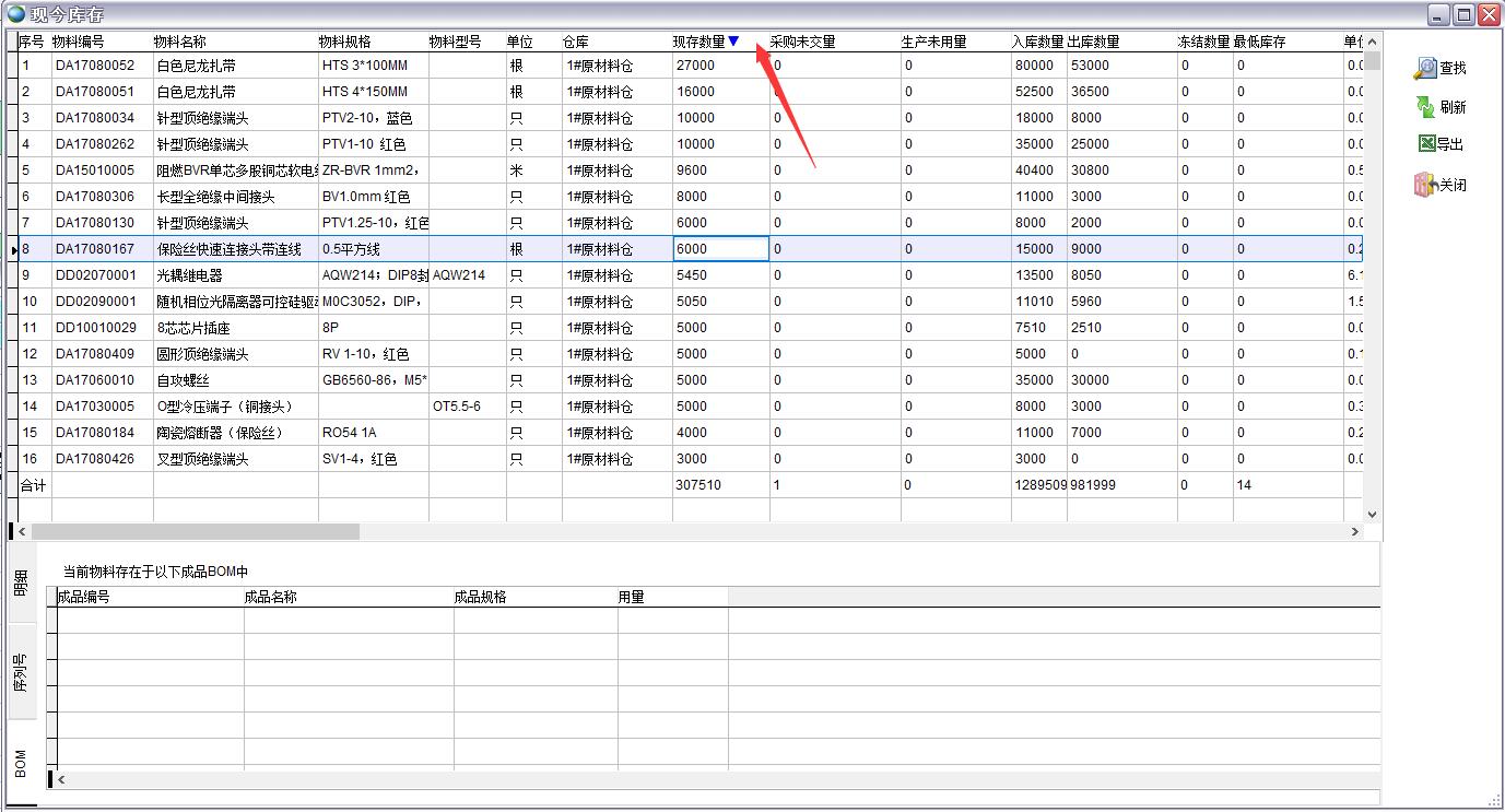 成品BOM 點(diǎn)擊某行物料可以看到該物料在哪些BOM中存在 直接顯示庫存信息 在配置文件中勾選現(xiàn)今庫存打開直接顯示庫存信息后,打開現(xiàn)今庫存就直接按默認(rèn)查詢條件顯示庫存信息,否則只有點(diǎn)查找后才會有庫存信息