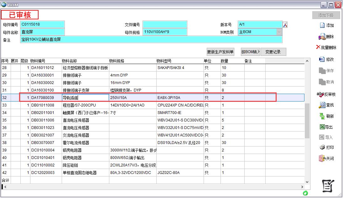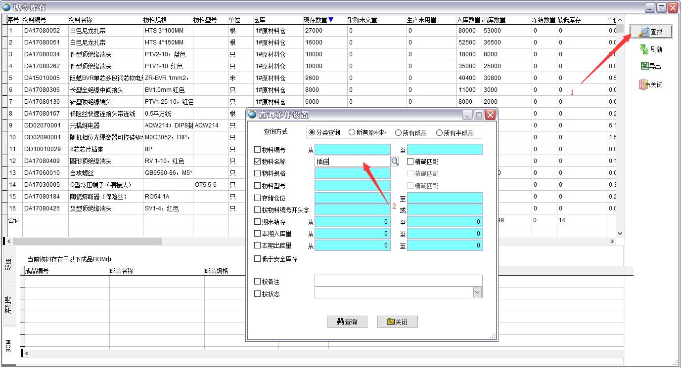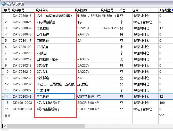 查詢出所有物料名稱中包含插座的物料,如果需要完全匹配可以勾選精確匹配