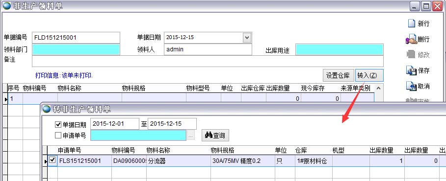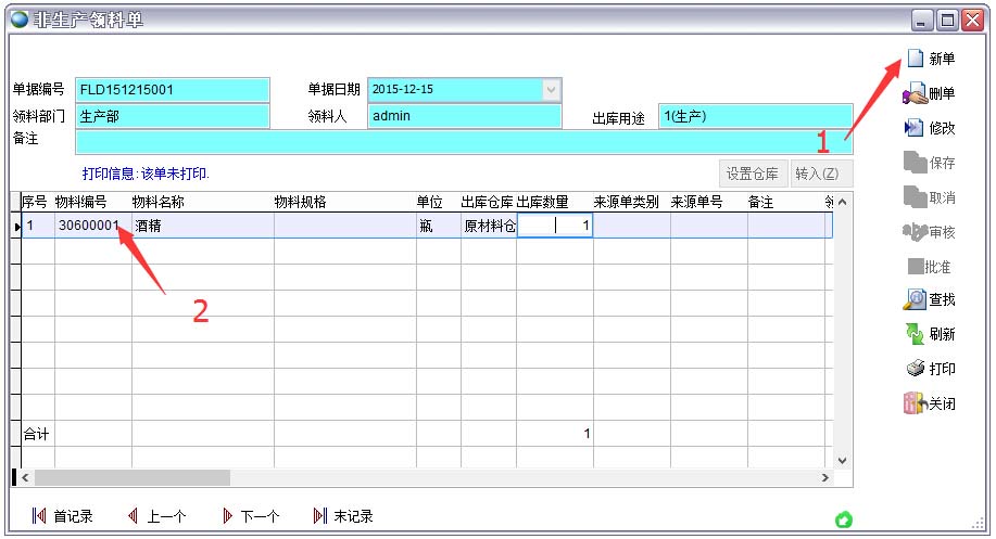 打開路徑:主菜單->倉(cāng)庫(kù)->出庫(kù)單->非生產(chǎn)領(lǐng)料單