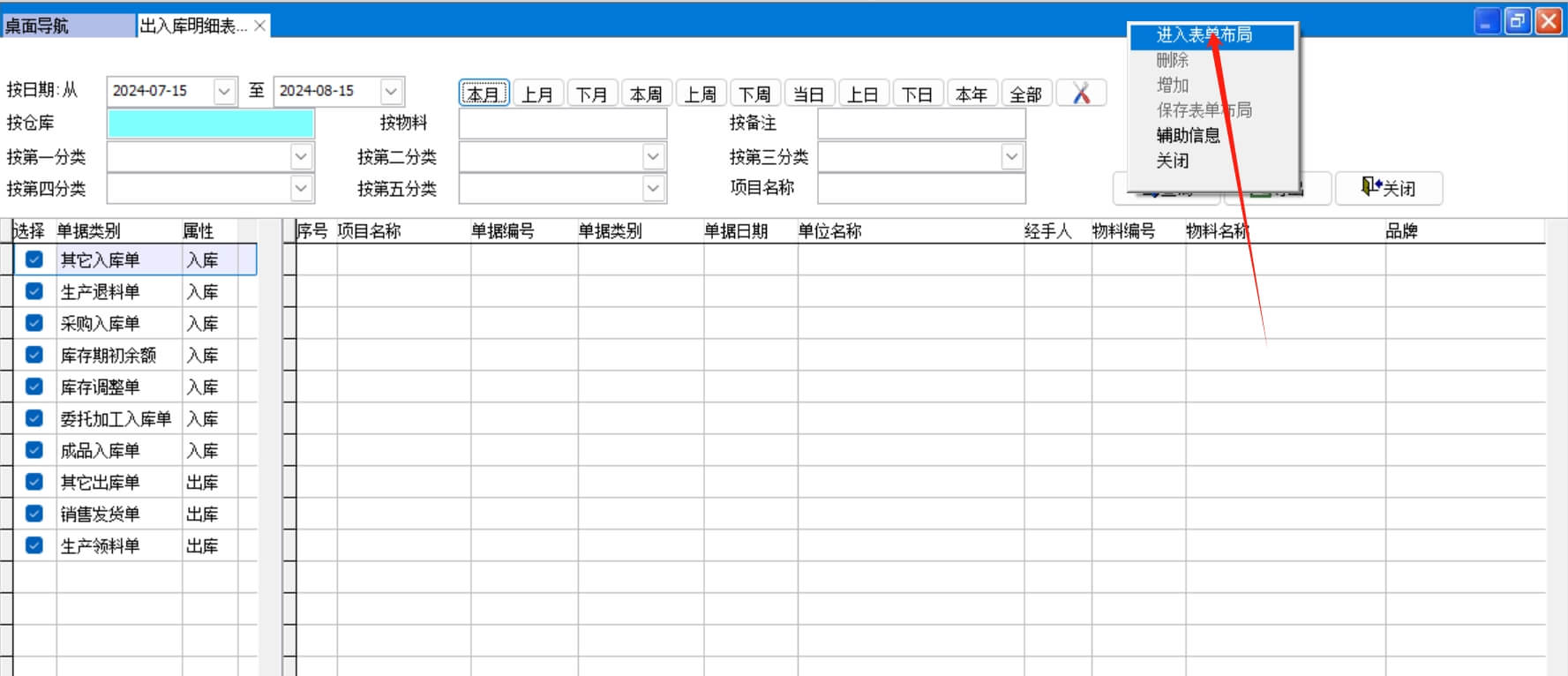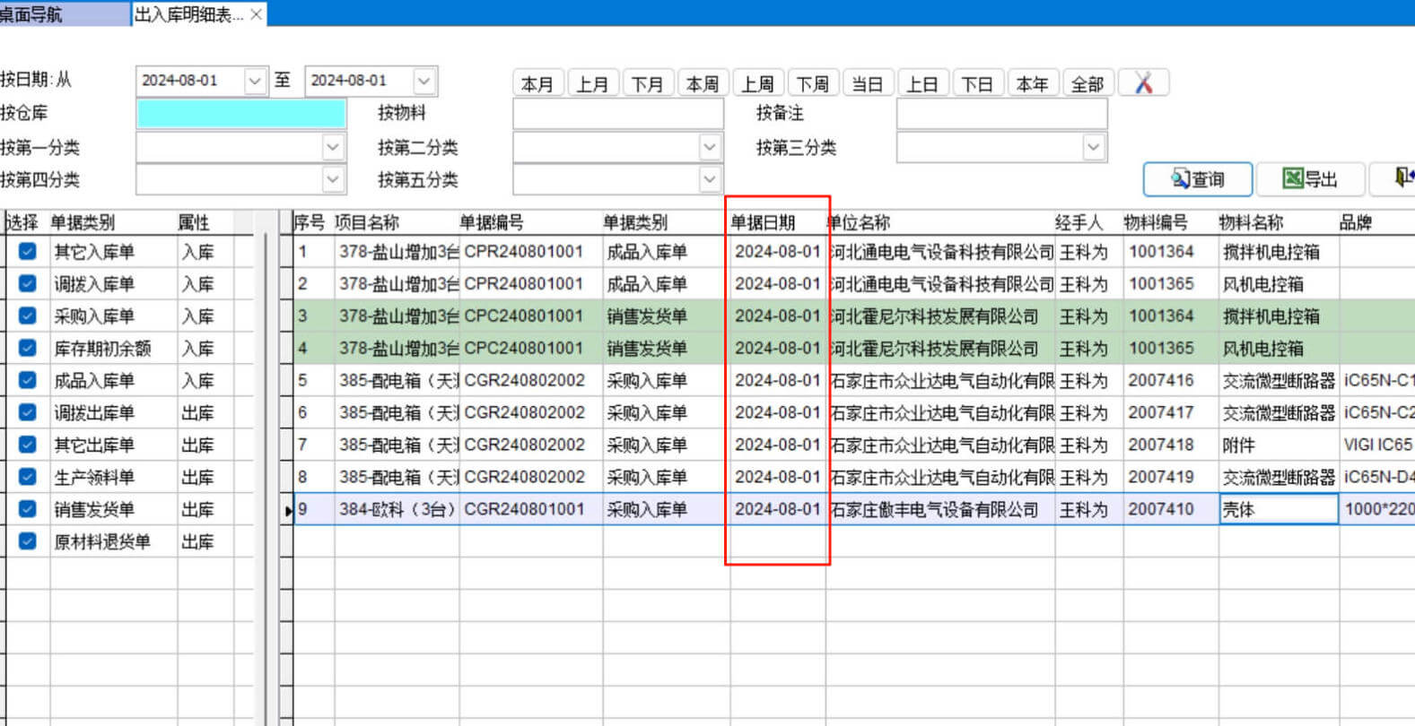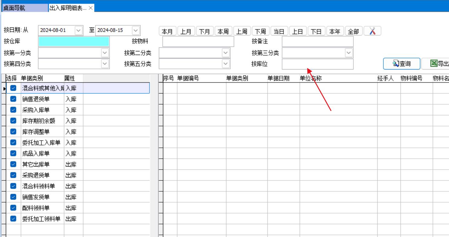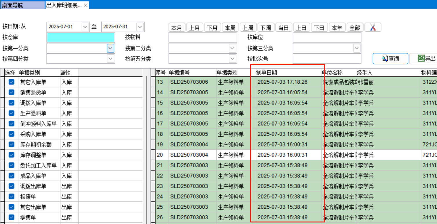 可以按物料分類、單據(jù)類別、倉(cāng)庫(kù)、物料、單據(jù)日期進(jìn)行查詢